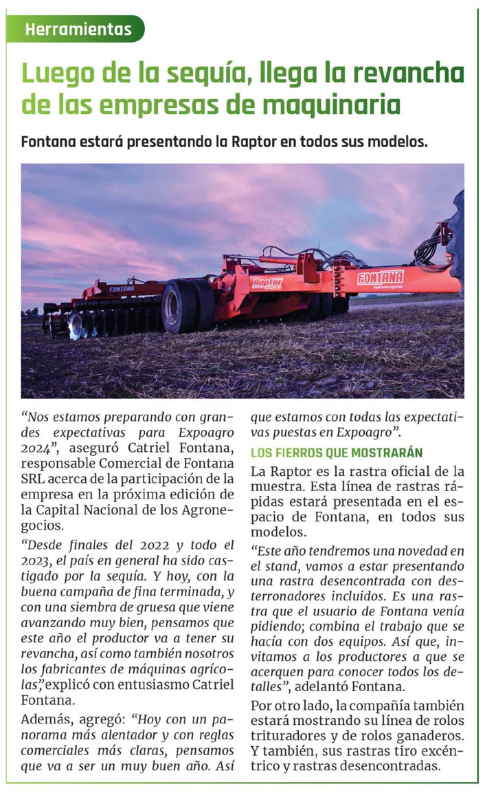 Fontana estará presentando la Raptor en todos sus modelos«Nos estamos preparando con grandes expectativas para Expoagro 2024″, aseguró Catriel Fontana, responsable Comercial de Fontana SRL acerca de la participación de la empresa en la próxima edición de la Capital Nacional de los Agronegocios.»Desde finales del 2022 y todo el 2023, el país en general ha sido castigado por la sequía. Y hoy, con la buena campaña defina terminada, y con una siembra de gruesa que viene avanzando muy bien, pensamos que este año el productor va a tener su revancha, así como también nosotros los fabricantes de máquinas agrícolas» explicó con entusiasmo Catriel Fontana. Además, agregó: «Hoy con un panorama más alentador y con reglas comerciales más claras, pensamos que va a ser un muy buen año. Así que estamos con todas las expectativas puestas en Expoagro«.LOS FIERROS QUE MOSTRARÁN La Raptor es la rastra oficial de la muestra. Esta línea de rastras rápidas estará presentada en el espacio de Fontana, en todos sus modelos. «Este año tendremos una novedad en el stand, vamos a estar presentando una rastra desencontrada con des- terronadores incluidos. Es una rastra que el usuario de Fontana venía pidiendo; combina el trabajo que se hacía con dos equipos. Así que, invitamos a los productores a que se acerquen para conocer todos los detalles», adelantó Fontana.Por otro lado, la compañía también estará mostrando su línea de rolos trituradores y de rolos ganaderos. Y también, sus rastras tiro excéntrico y rastras desencontradas.
