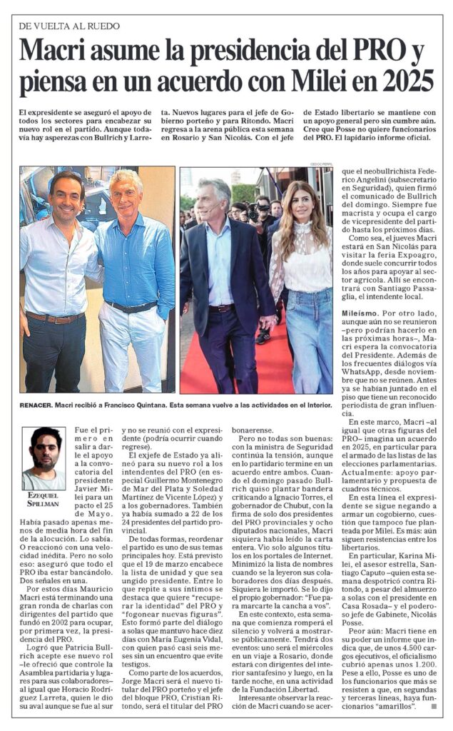 Mileísmo. Por otro lado, aunque aún no se reunieron ?pero podrían hacerlo en las próximas horas?, Macri espera la convocatoria del Presidente. Además de los frecuentes diálogos vía WhatsApp, desde noviembre que no se reúnen. Antes ya se habían juntado en el piso que tiene un reconocido periodista de gran influencia.