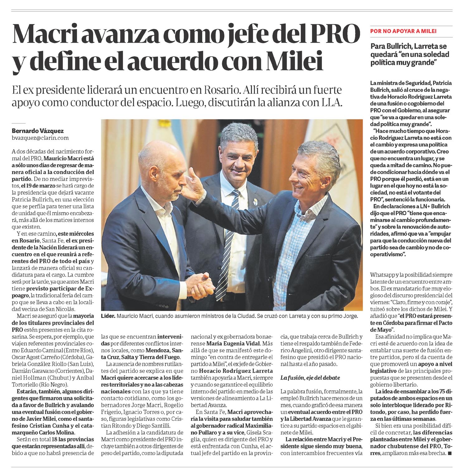 El ex presidente liderará un encuentro en Rosario. Allí recibirá un fuerte apoyo como conductor del espacio. Luego, discutirán la alianza con LLA.bvazquez@clarin.comA dos décadas del nacimiento formal del PRO, Mauricio Macri está a sólo unos días de regresar de manera oficial a la conducción del partido. De no mediar imprevistos, el 19 de marzo se hará cargo de la presidencia que dejará vacante Patricia Bullrich, en una elección que se perfila para tener una lista de unidad que él mismo encabezará, más allá de los matices internos que existen.Y en ese camino, este miércoles en Rosario, Santa Fe, el ex presidente de la Nación liderará un encuentro en el que reunirá a referentes del PRO de todo el país y lanzará de manera oficial su candidatura para el cargo. La cumbre será por la tarde, ya que antes Macri tiene previsto participar de Expoagro, la tradicional feria del campo que se lleva a cabo en la localidad vecina de San Nicolás.Macri se aseguró que la mayoría de los titulares provinciales del PRO estén presentes en la cita rosarina.Se espera, por ejemplo, que viajen referentes provinciales como Eduardo Caminal (Entre Ríos), Oscar Agost Carreño (Córdoba), Gabriela González Riollo (San Luis), Damián Garavano (Corrientes), Daniel Hollman (Chubut) y Aníbal Tortoriello (Río Negro).Estarán, también, algunos dirigentes que firmaron una solicitada a favor de Bullrich y avalando una eventual fusión con el gobierno de Javier Milei, como el santafesino Cristian Cunha y el catamarqueño Carlos Molina.Serán en total 18 las provincias que estarán representadas allí, debido a que no habrá presencia de las que se encuentran intervenidas por diferentes conflictos internos locales, como Mendoza, Santa Cruz, Salta y Tierra del Fuego.La ausencia de nombres rutilantes del partido se explica en que Macri quiere acercarse a los líderes territoriales y no a las cabezas nacionales con las que ya tiene contacto cotidiano, como los gobernadores Jorge Macri, Rogelio Frigerio, Ignacio Torres o, por caso, figuras legislativas como Cristian Ritondo y Diego Santilli.La adhesión a la candidatura de Macri como presidente del PRO incluye también a otros dirigentes de peso del partido, como la diputada nacional y ex gobernadora bonaerense María Eugenia Vidal. Más allá de que se manifestó este domingo «en contra de entregarle el partido a Milei», el ex jefe de Gobierno Horacio Rodríguez Larreta también apoyaría a Macri, siempre y cuando se garantice el equilibrio interno del partido en medio de las versiones de alineamiento a La Libertad Avanza.En Santa Fe, Macri aprovecharía la visita para saludar también al gobernador radical Maximiliano Pullaro y a su vice, Gisela Scaglia, quien es dirigente del PRO y está enfrentada con Cunha, el actual jefe del partido en la provincia, que trabaja cerca de Bullrich y tiene el respaldo también de Federico Angelini, otro dirigente santafesino que presidió el PRO nacional hasta el año pasado.La fusión, eje del debate La palabra fusión, formalmente, la empleó Bullrich hace menos de un mes, cuando graficó de esa manera un eventual acuerdo entre el PRO y la Libertad Avanza que le garantice a su partido espacios en el gabinete de Milei.La relación entre Macri y el Presidente sigue siendo muy buena, con intercambios frecuentes vía Whatsapp y la posibilidad siempre latente de un encuentro entre ambos.El ex mandatario fue muy elogioso del discurso presidencial del viernes: «Claro, firme y con coraje», tuiteó sobre los dichos de Milei. Y añadió que «el PRO estará presente en Córdoba para firmar el Pacto de Mayo».Esa afinidad no implica que Macri esté de acuerdo con la idea de entablar una suerte de fusión entre partidos, pero sí da cuenta de que promoverá un apoyo a nivel legislativo de las principales propuestas que se presenten desde el gobierno libertario.La idea de ensamblar a los 75 diputados de ambos espacios en un solo interbloque liderado por Ritondo, por caso, ha perdido fuerza en las últimas semanas.Si bien era una posibilidad difícil de concretar, las diferencias planteadas entre Milei y el gobernador chubutense del PRO, Torres, ampliaron más esa brecha.Líder. Mauricio Macri, cuando asumieron ministros de la Ciudad. Se cruzó con Larreta y con su primo Jorge.POR NO APOYAR A MILEIPara Bullrich, Larreta se quedará «en una soledad política muy grande»La ministra de Seguridad, Patricia Bullrich, salió al cruce de la negativa de Horacio Rodríguez Larreta de una fusión o cogobierno del PRO con el Gobierno, al asegurar que «se va a quedar en una soledad política muy grande».»Hace mucho tiempo que Horacio Rodríguez Larreta no está con el cambio y expresa una política de un acuerdo corporativo. Creo que no encuentra un lugar, y se queda a mitad de camino. No puede condicionar hacia dónde va el PRO porque él perdió, está en un lugar en el que hoy no está la sociedad, no está el votante del PRO», sentenció la funcionaria.En declaraciones a LN+ Bullrich dijo que el PRO «tiene que encaminarse al cambio profundamente» y sobre la renovación de autoridades, afirmó que va a «empujar para que la conducción nueva del partido sea de cambio y no de cooperativismo».