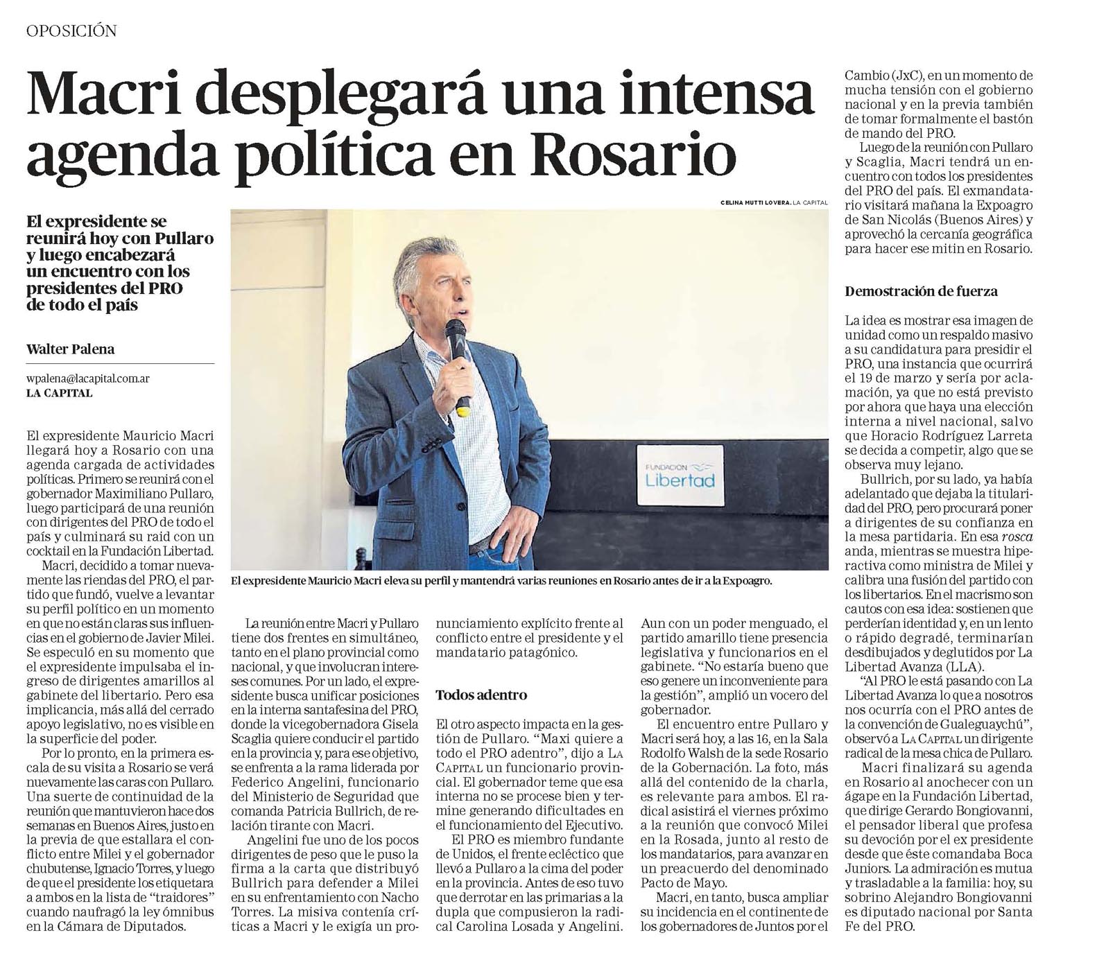 Macri desplegará una intensa agenda política en RosarioEl expresidente se reunirá hoy con Pullaro y luego encabezaráun encuentro con los presidentes del PROde todo el paísWalter Palenpalenalacapitalcomar LA CAPITALEl expresidente Mauricio Macri llegará hoy a Rosario con una agenda cargada de actividades políticas. Primero se reunirá conel gobernador Maximiliano Pullaro, luego participará de una reunión con dirigentes del PRO de todoel país y culminará su raid con un cocktail en la Fundación Libertad.Macri, decidido a tomar nuevamente las riendas del PRO, el partido que fundó, vuelve a levantar su perfil político en un momento en quenoestán claras sus influencias en el gobierno de Javier Milei. Se especuló en su momento que el expresidente impulsaba el ingreso de dirigentes amarillos al gabinete del libertario. Pero esa implicancia, más allá del cerrado apoyo legislativo, no es visible en la superficie del poder.Porlo pronto, en la primera escala desu visita a Rosario se verá nuevamente las caras con Pullaro. Una suerte de continuidad de la reunión que mantuvieron hace dos semanas en Buenos Aires, justo en la previa de que estallara el conflicto entre Milei y el gobernador chubutense, Ignacio Torres, y luego de queel presidente losetiquetara aambos en la lista de “traidores” cuando naufragó la ley ómnibus en la Cámara de Diputados.5-3El expresidente Mauricio Macri eleva su perfil y mantendrá varias reuniones en Rosario antes dera la Expoagro.La reunión entre Macri y Pullaro tiene dos frentes en simultáneo, tanto en el plano provincial como nacional, y que involucran intereses comunes. Por un lado, el expresidente busca unificar posiciones enla interna santafesina del PRO, donde la vicegobernadora Gisela Scaglia quiere conducir el partido enla provincia y, para ese objetivo, se enfrenta a la rama liderada por Federico Angelini, funcionario del Ministerio de Seguridad que comanda Patricia Bullrich, de relación tirante con Macri.Angelini fue uno de los pocos dirigentes de peso que le puso la firma a la carta que distribuyó Bullrich para defender a Milei en su enfrentamiento con Nacho Torres. La misiva contenía críticas a Macri y le exigía un pro-nunciamiento explícito frente al conflicto entre el presidente y el mandatario patagónico.Todos adentroEl otro aspecto impacta en la gestión de Pullaro. “Maxi quiere a todo el PRO adentro”, dijo a La CAPITAL un funcionario provincial. El gobernador teme que esa interna no se procese bien y termine generando dificultades en el funcionamiento del Ejecutivo.El PRO es miembro fundante de Unidos, el frente ecléctico que llevó a Pullaro a la cima del poder enla provincia. Antes de eso tuvo que derrotar en las primarias a la dupla que compusieron la radical Carolina Losada y Angelini.LibertadAun con un poder menguado, el partido amarillo tiene presencia legislativa y funcionarios en el gabinete. “No estaría bueno que eso genere un inconveniente para la gestión”, amplió un vocero del gobernador.El encuentro entre Pullaro y Macri será hoy, a las 16, en la Sala Rodolfo Walsh de la sede Rosario de la Gobernación. La foto, más allá del contenido de la charla, es relevante para ambos. El radical asistirá el viernes próximo a la reunión que convocó Milei en la Rosada, junto al resto de los mandatarios, para avanzaren un preacuerdo del denominado Pacto de Mayo.Macri, en tanto, busca ampliar su incidencia en el continente de los gobernadores de Juntos porelCambio (JxC), en un momento de mucha tensión con el gobierno nacional y en la previa también de tomar formalmente el bastón de mando del PRO.Luego de la reunión con Pullaro y Scaglia, Macri tendrá un encuentro con todos los presidentes del PRO del país. El exmandatario visitará mañana la Expoagro de San Nicolás (Buenos Aires) y aprovechó la cercanía geográfica para hacer ese mitin en Rosario.Demostración de fuerzaLa idea es mostrar esa imagen de unidad como un respaldo masivo asu candidatura para presidir el PRO, una instancia que ocurrirá el 19 de marzo y sería por aclamación, ya que no está previsto por ahora que haya una elección interna a nivel nacional, salvo que Horacio Rodríguez Larreta se decida a competir, algo que se observa muy lejano.Bullrich, por su lado, ya había adelantado que dejaba la titularidad del PRO, pero procurará poner a dirigentes de su confianza en la mesa partidaria. En esa rosca anda, mientras se muestra hiperactiva como ministra de Milei y calibra una fusión del partido con los libertarios. Enel macrismo son cautos con esa idea: sostienen que perderían identidad y, en un lento o rápido degradé, terminarían desdibujados y deglutidos por La Libertad Avanza (LLA).“Al PRO le está pasando con La Libertad Avanza lo quea nosotros nos ocurría con el PRO antes de la convención de Gualeguaychú”, observóa La CaprraL un dirigente radical de la mesa chica de Pullaro.Macri finalizará su agenda en Rosario al anochecer con un ágape en la Fundación Libertad, que dirige Gerardo Bongiovanni, el pensador liberal que profesa su devoción por el ex presidente desde que éste comandaba Boca Juniors. La admiración es mutua y trasladable a la familia: hoy, su sobrino Alejandro Bongiovanni es diputado nacional por Santa Fe del PRO.