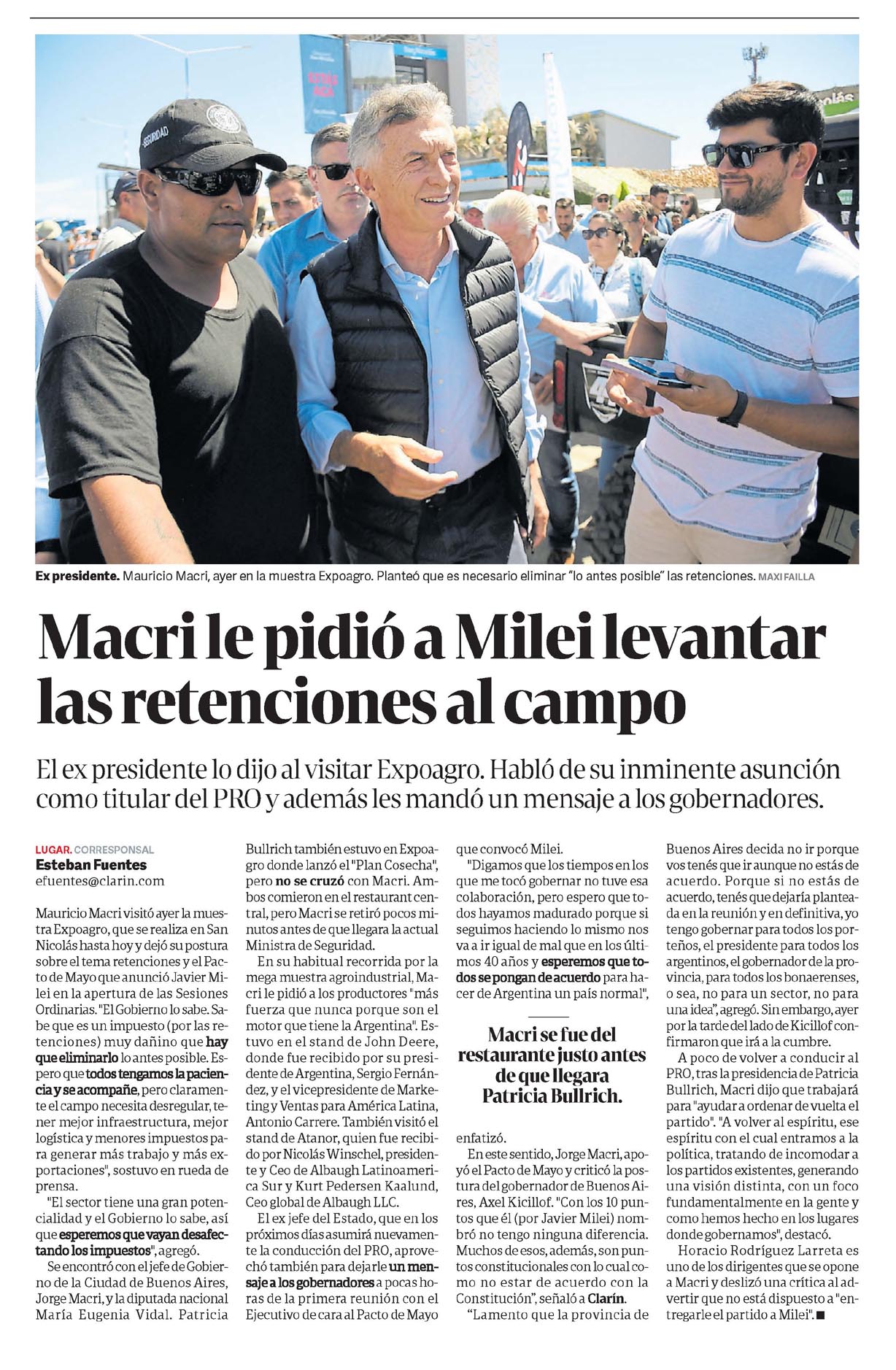 El ex presidente lo dijo al visitar Expoagro. Habló de su inminente asunción como titular del PRO y además les mandó un mensaje a los gobernadores.efuentes@clarin.comMauricio Macri visitó ayer la muestra Expoagro, que se realiza en San Nicolás hasta hoy y dejó su postura sobre el tema retenciones y el Pacto de Mayo que anunció Javier Milei en la apertura de las Sesiones Ordinarias. «El Gobierno lo sabe. Sabe que es un impuesto (por las retenciones) muy dañino que hay que eliminarlo lo antes posible. Espero que todos tengamos la paciencia y se acompañe, pero claramente el campo necesita desregular, tener mejor infraestructura, mejor logística y menores impuestos para generar más trabajo y más exportaciones», sostuvo en rueda de prensa.»El sector tiene una gran potencialidad y el Gobierno lo sabe, así que esperemos que vayan desafectando los impuestos», agregó.Se encontró con el jefe de Gobierno de la Ciudad de Buenos Aires, Jorge Macri, y la diputada nacional María Eugenia Vidal. Patricia Bullrich también estuvo en Expoagro donde lanzó el «Plan Cosecha», pero no se cruzó con Macri. Ambos comieron en el restaurant central, pero Macri se retiró pocos minutos antes de que llegara la actual Ministra de Seguridad.En su habitual recorrida por la mega muestra agroindustrial, Macri le pidió a los productores «más fuerza que nunca porque son el motor que tiene la Argentina». Estuvo en el stand de John Deere, donde fue recibido por su presidente de Argentina, Sergio Fernández, y el vicepresidente de Marketing y Ventas para América Latina, Antonio Carrere. También visitó el stand de Atanor, quien fue recibido por Nicolás Winschel, presidente y Ceo de Albaugh Latinoamerica Sur y Kurt Pedersen Kaalund, Ceo global de Albaugh LLC.El ex jefe del Estado, que en los próximos días asumirá nuevamente la conducción del PRO, aprovechó también para dejarle un mensaje a los gobernadores a pocas horas de la primera reunión con el Ejecutivo de cara al Pacto de Mayo que convocó Milei.»Digamos que los tiempos en los que me tocó gobernar no tuve esa colaboración, pero espero que todos hayamos madurado porque si seguimos haciendo lo mismo nos va a ir igual de mal que en los últimos 40 años y esperemos que todos se pongan de acuerdo para hacer de Argentina un país normal», enfatizó.En este sentido, Jorge Macri, apoyó el Pacto de Mayo y criticó la postura del gobernador de Buenos Aires, Axel Kicillof. «Con los 10 puntos que él (por Javier Milei) nombró no tengo ninguna diferencia.Muchos de esos, además, son puntos constitucionales con lo cual como no estar de acuerdo con la Constitución», señaló a Clarín.»Lamento que la provincia de Buenos Aires decida no ir porque vos tenés que ir aunque no estás de acuerdo. Porque si no estás de acuerdo, tenés que dejaría planteada en la reunión y en definitiva, yo tengo gobernar para todos los porteños, el presidente para todos los argentinos, el gobernador de la provincia, para todos los bonaerenses, o sea, no para un sector, no para una idea», agregó. Sin embargo, ayer por la tarde del lado de Kicillof confirmaron que irá a la cumbre.A poco de volver a conducir al PRO, tras la presidencia de Patricia Bullrich, Macri dijo que trabajará para «ayudar a ordenar de vuelta el partido». «A volver al espíritu, ese espíritu con el cual entramos a la política, tratando de incomodar a los partidos existentes, generando una visión distinta, con un foco fundamentalmente en la gente y como hemos hecho en los lugares donde gobernamos», destacó.Horacio Rodríguez Larreta es uno de los dirigentes que se opone a Macri y deslizó una crítica al advertir que no está dispuesto a «entregarle el partido a Milei».Macri se fue del restaurante justo antes de que llegara Patricia Bullrich.Ex presidente. Mauricio Macri, ayer en la muestra Expoagro. Planteó que es necesario eliminar «lo antes posible» las retenciones. MAXI FAILLA