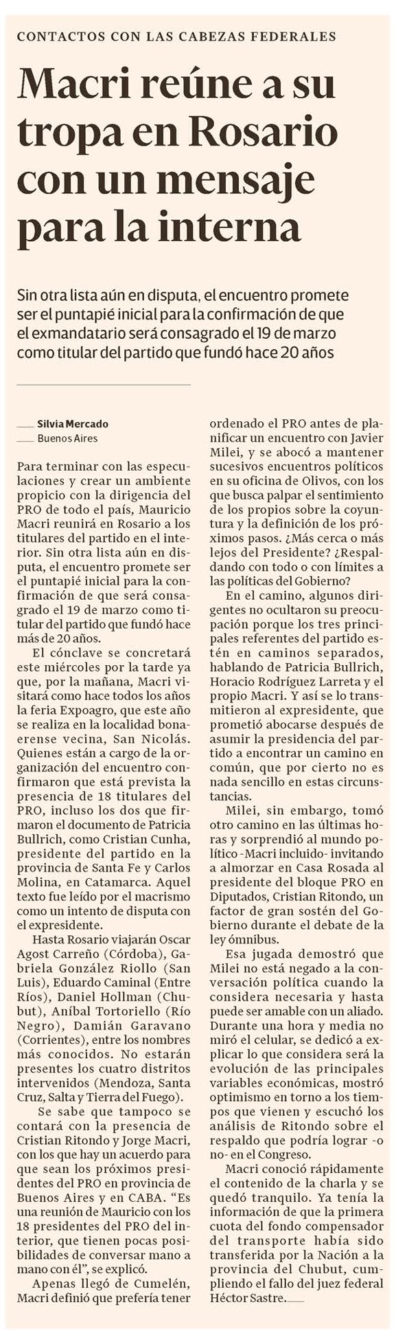 Apenas llegó de Cumelén, Macri definió que prefería tener ordenado el PRO antes de planificar un encuentro con Javier Milei, y se abocó a mantener sucesivos encuentros políticos en su oficina de Olivos, con los que busca palpar el sentimiento de los propios sobre la coyuntura y la definición de los próximos pasos. ¿Más cerca o más lejos del Presidente? ¿Respaldando con todo o con límites a las políticas del Gobierno? En el camino, algunos dirigentes no ocultaron su preocupación porque los tres principales referentes del partido estén en caminos separados, hablando de Patricia Bullrich, Horacio Rodríguez Larreta y el propio Macri. Y así se lo transmitieron al expresidente, que prometió abocarse después de asumir la presidencia del partido a encontrar un camino en común, que por cierto no es nada sencillo en estas circunstancias.