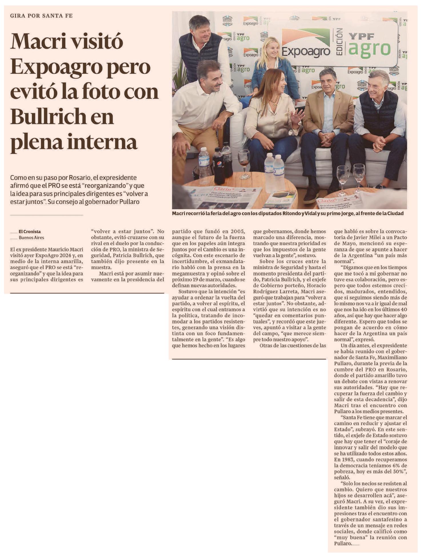 Como en su paso por Rosario, el expresidente afirmó que el PRO se está «reorganizando» y que la idea para sus principales dirigentes es «volver a estar juntos». Su consejo al gobernador PullaroMacri recorrió la feria del agro con los diputados Ritondo y Vidal y su primo Jorge, al frente de la CiudadEl ex presidente Mauricio Macri visitó ayer ExpoAgro 2024 y, en medio de la interna amarilla, aseguró que el PRO se está «reorganizando» y que la idea para sus principales dirigentes es «volver a estar juntos». No obstante, evitó cruzarse con su rival en el duelo por la conducción de PRO, la ministra de Seguridad, Patricia Bullrich, que también dijo presente en la muestra.Macri está por asumir nuevamente en la presidencia del partido que fundó en 2005, aunque el futuro de la fuerza que en los papeles aún integra Juntos por el Cambio es una incógnita.Con este escenario de incertidumbre, el exmandatario habló con la prensa en la megamuestra y opinó sobre el próximo 19 de marzo, cuando se definan nuevas autoridades.Sostuvo que la intención «es ayudar a ordenar la vuelta del partido, a volver al espíritu, el espíritu con el cual entramos a la política, tratando de incomodar a los partidos resistentes, generando una visión distinta con un foco fundamentalmente en la gente». «Es algo que hemos hecho en los lugares que gobernamos, donde hemos marcado una diferencia, mostrando que nuestra prioridad es que los impuestos de la gente vuelvan a la gente», sostuvo.Sobre los cruces entre la ministra de Seguridad y hasta el momento presidenta del partido, Patricia Bullrich, y el exjefe de Gobierno porteño, Horacio Rodríguez Larreta, Macri aseguró que trabajan para «volver a estar juntos». No obstante, advirtió que su intención es no «quedar en comentarios puntuales», y recordó que este jueves, apuntó a visitar a la gente del campo, «que merece siempre todo nuestro apoyo».Otras de las cuestiones de las que habló es sobre la convocatoria de Javier Milei a un Pacto de Mayo, mencionó su esperanza de que se apunte a hacer de la Argentina «un país más normal».»Digamos que en los tiempos que me tocó a mí gobernar no tuve esa colaboración, pero espero que todos estemos crecidos, madurados, entendidos, que si seguimos siendo más de lo mismo nos va a ir igual de mal que nos ha ido en los últimos 40 años, así que hay que hacer algo diferente. Espero que todos se pongan de acuerdo en cómo hacer de la Argentina un país normal», expresó.Un día antes, el expresidente se había reunido con el gobernador de Santa Fe, Maximiliano Pullaro, durante la previa de la cumbre del PRO en Rosario, donde el partido amarillo tuvo un debate con vistas a renovar sus autoridades. «Hay que recuperar la fuerza del cambio y salir de esta decadencia», dijo Macri tras el encuentro con Pullaro a los medios presentes.»Santa Fe tiene que marcar el camino en reducir y ajustar el Estado», subrayó. En este sentido, el exjefe de Estado sostuvo que hay que tener el «coraje de innovar y salir del modelo que se ha utilizado todos estos años.En 1983, cuando recuperamos la democracia teníamos 6% de pobreza, hoy es más del 50%», señaló.»Solo los necios se resisten al cambio. Quiero que nuestros hijos se desarrollen acá», aseguró Macri. A su vez, el expresidente también dio sus impresiones tras el encuentro con el gobernador santafesino a través de un mensaje en redes sociales, donde calificó como «muy buena» la reunión con Pullaro.