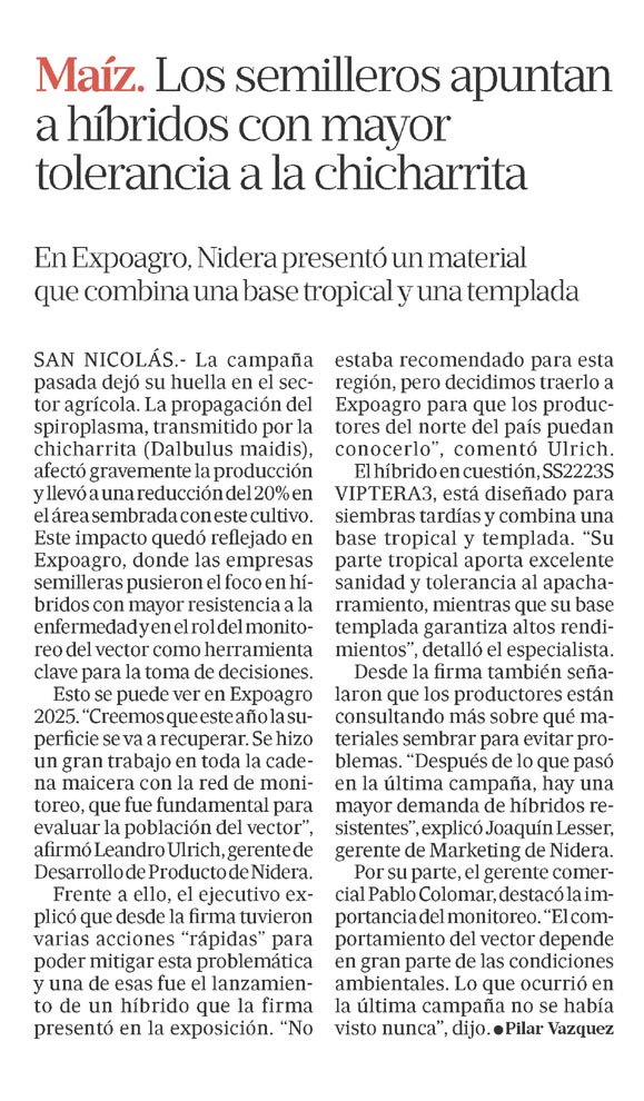… (Dalbulus maidis), afectó gravemente la producción y llevó a una reducción del 20% en el área sembrada con este cultivo. Este impacto quedó reflejado en Expoagro, donde las empresas semilleras pusieron el foco en híbridos con mayor resistencia a la enfermedad y en el rol del monito- reo del vector como herramienta…