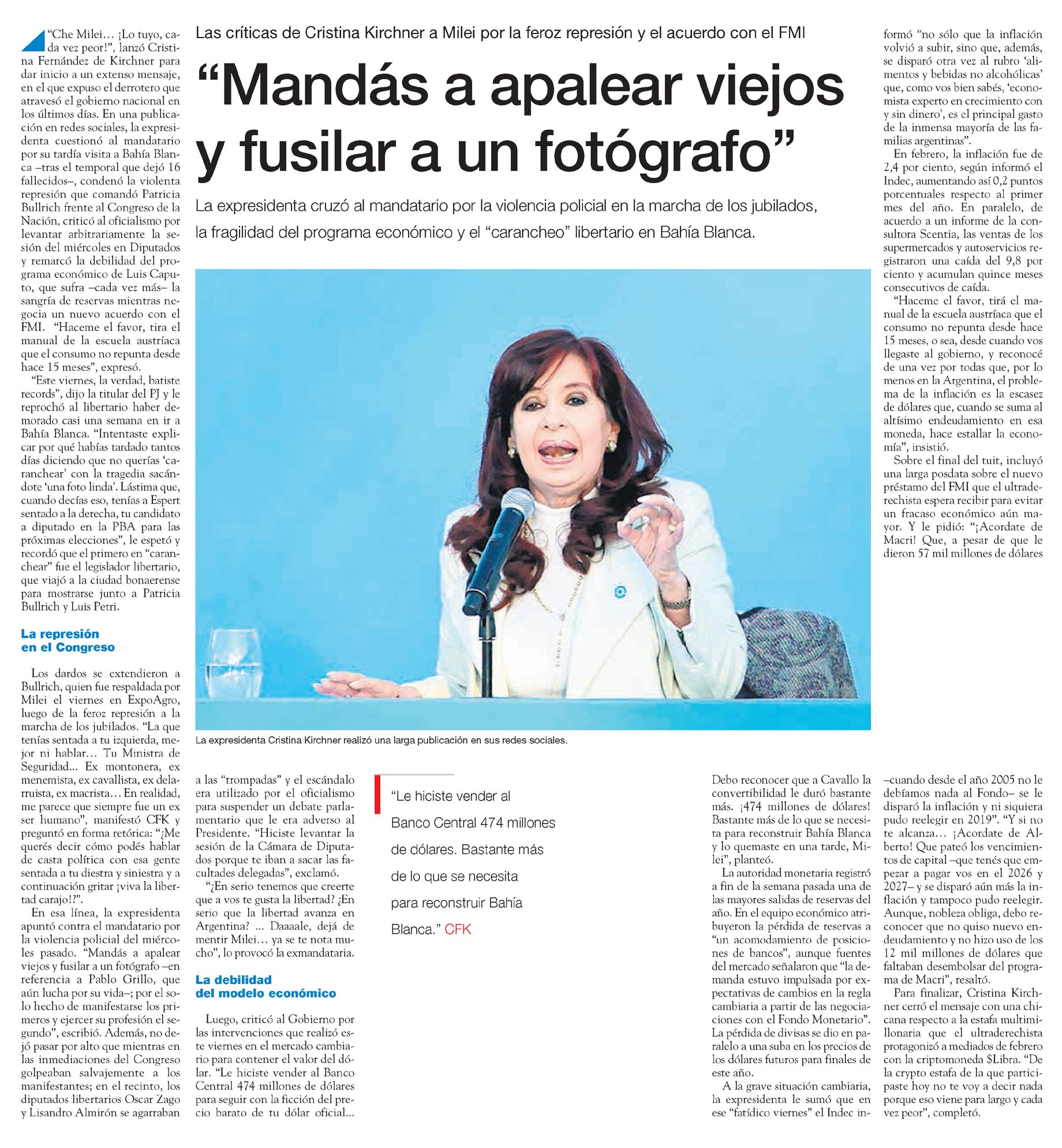 La expresidenta cruzó al mandatario por la violencia policial en la marcha de los jubilados, la fragilidad del programa económico y el «carancheo» libertario en Bahía Blanca.