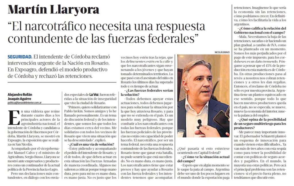 SEGURIDAD. El intendente de Córdoba reclamó intervención urgente de la Nación en Rosario. En Expoagro, defendió el modelo productivo de Córdoba y rechazó las retenciones.