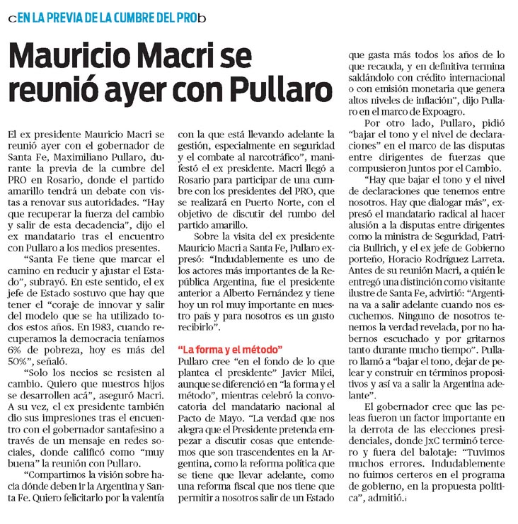 El ex presidente Mauricio Macri se reunió ayer con el gobernador de Santa Fe, Maximiliano Pullaro, durante la previa de la cumbre del PRO en Rosario, donde el partido amarillo tendrá un debate con vistas a renovar sus autoridades. «Hay que recuperar la fuerza del cambio y salir de esta decadencia», dijo el ex mandatario tras el encuentro con Pullaro a los medios presentes.»Santa Fe tiene que marcar el camino en reducir y ajustar el Estado», subrayó. En este sentido, el ex jefe de Estado sostuvo que hay que tener el «coraje de innovar y salir del modelo que se ha utilizado todos estos años. En 1983, cuando recuperamos la democracia teníamos 6% de pobreza, hoy es más del 50%», señaló.»Solo los necios se resisten al cambio. Quiero que nuestros hijos se desarrollen acá», aseguró Macri.A su vez, el ex presidente también dio sus impresiones tras el encuentro con el gobernador santafesino a través de un mensaje en redes sociales, donde calificó como «muy buena» la reunión con Pullaro.»Compartimos la visión sobre hacia dónde deben ir la Argentina y Santa Fe. Quiero felicitarlo por la valentía con la que está llevando adelante la gestión, especialmente en seguridad y el combate al narcotráfico», manifestó el ex presidente. Macri llegó a Rosario para participar de una cumbre con los presidentes del PRO, que se realizará en Puerto Norte, con el objetivo de discutir del rumbo del partido amarillo.Sobre la visita del ex presidente Mauricio Macri a Santa Fe, Pullaro expresó: «Indudablemente es uno de los actores más importantes de la República Argentina, fue el presidente anterior a Alberto Fernández y tiene hoy un rol muy importante en nuestro país y para nosotros es un gusto recibirlo».»La forma y el método» Pullaro cree «en el fondo de lo que plantea el presidente» Javier Milei, aunque se diferenció en «la forma y el método», mientras celebró la convocatoria del mandatario nacional al Pacto de Mayo. «La verdad que nos alegra que el Presidente pretenda empezar a discutir cosas que entendemos que son trascendentes en la Argentina, como la reforma política que se tiene que llevar adelante, como una reforma fiscal que nos tiene que permitir a nosotros salir de un Estado que gasta más todos los años de lo que recauda, y en definitiva termina saldándolo con crédito internacional o con emisión monetaria que genera altos niveles de inflación», dijo Pullaro en el marco de Expoagro.Por otro lado, Pullaro, pidió «bajar el tono y el nivel de declaraciones» en el marco de las disputas entre dirigentes de fuerzas que compusieron Juntos por el Cambio.»Hay que bajar el tono y el nivel de declaraciones que tenemos entre nosotros. Hay que dialogar más», expresó el mandatario radical al hacer alusión a la disputas entre dirigentes como la ministra de Seguridad, Patricia Bullrich, y el ex jefe de Gobierno porteño, Horacio Rodríguez Larreta.Antes de su reunión Macri, a quién le entregó una distinción como visitante ilustre de Santa Fe, advirtió: «Argentina va a salir adelante cuando nos escuchemos.Ninguno de nosotros tenemos la verdad revelada, por no habernos escuchado y por gritarnos tanto durante mucho tiempo». Pullaro llamó a «bajar el tono, dejar de pelear y construir en términos propositivos y así va a salir la Argentina adelante».El gobernador cree que las peleas fueron un factor importante en la derrota de las elecciones presidenciales, donde JxC terminó tercero y fuera del balotaje: «Tuvimos muchos errores. Indudablemente no fuimos certeros en el programa de gobierno, en la propuesta política», admitió.