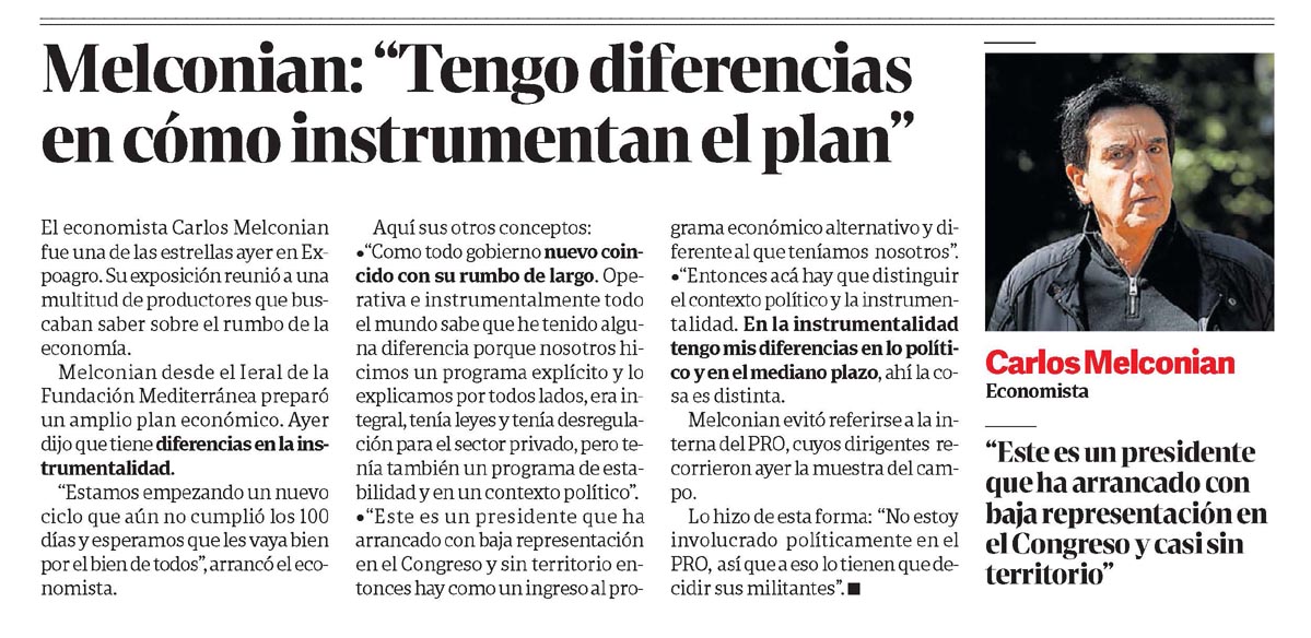 Aquí sus otros conceptos: ?»Como todo gobierno nuevo coincido con su rumbo de largo. Operativa e instrumentalmente todo el mundo sabe que he tenido alguna diferencia porque nosotros hicimos un programa explícito y lo explicamos por todos lados, era integral, tenía leyes y tenía desregulación para el sector privado, pero tenía también un programa de estabilidad y en un contexto político».