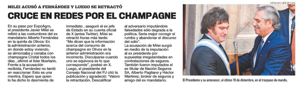 En su paso por ExpoAgro, el presidente Javier Milei se refirió a las costumbres del ex mandatario Alberto Fernández en la quinta de Olivos: En la administración anterior, en donde estoy viviendo, se almorzaba y cenaba con champagne Cristal todos los días , afirmó el líder libertario.Frente a la acusación recibida, Fernández no tardó en reaccionar: Esto es una mentira. Espero que quien lo ha dicho lo desmienta de inmediato , aseguró el ex jefe de Estado en su cuenta oficial de X (antes Twitter). Milei se retractó horas más tarde: «Me dicen que la información acerca del consumo de champagne en Olivos en la anterior administración era incorrecta. Disculparse cuando uno se equivoca es lo que corresponde», posteó en X.Luego, el presidente del Consejo Nacional del PJ citó la publicación y agradeció: «Valoro la retractación. Descalificar al adversario imputándole falsedades sólo degrada a la política. Sería mejor corregir el rumbo y abandonar el discurso del odio».La acusación de Milei surgió en medio de la imputación al ex presidente por supuestas irregularidades en contrataciones de seguros.También fueron imputados el ex titular de Nación Seguros SA, Alberto Pagliano y Héctor Martínez, broker de seguros y amigo del ex mandatario.El Presidente y su antecesor, el último 10 de diciembre, en el traspaso de mando