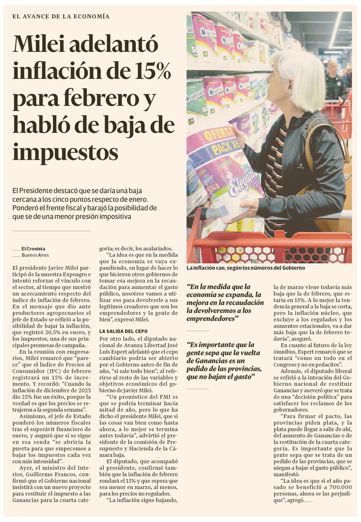 En la reunión con empresarios, Milei remarcó que «parece» que el Índice de Precios al Consumidor (IPC) de febrero registrará un 15% de incremento.
