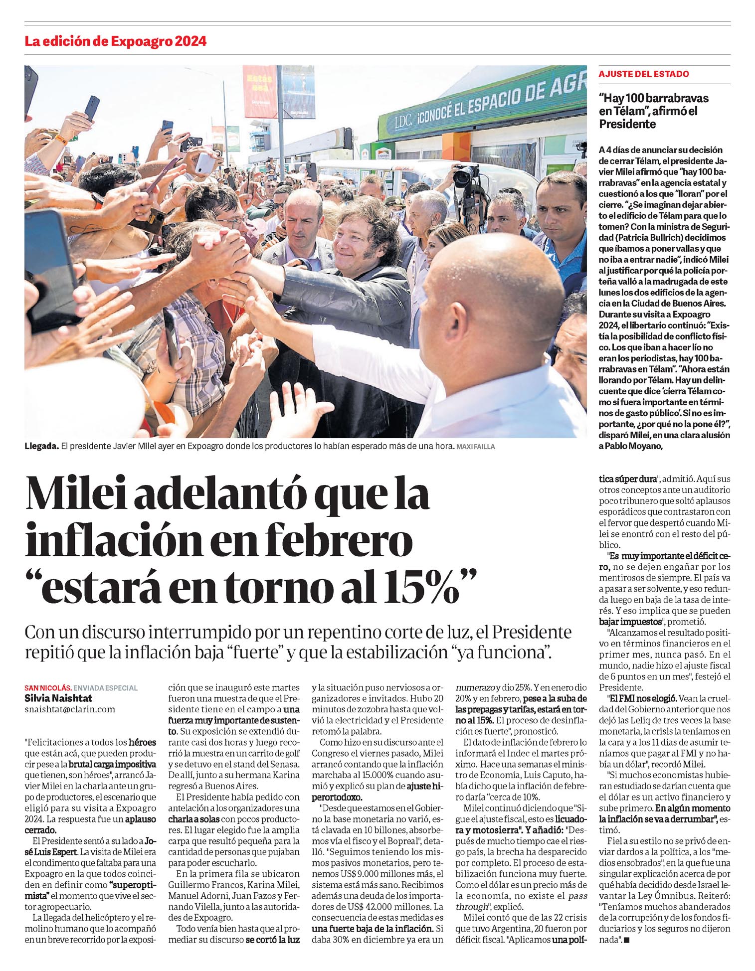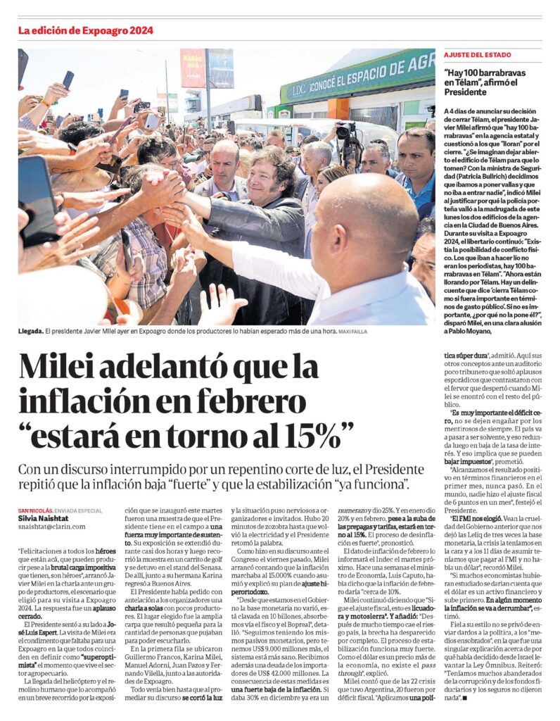 Los que iban a hacer lío no eran los periodistas, hay 100 barrabravas en Télam». «Ahora están llorando por Télam. Hay un delincuente que dice ?cierra Télam como si fuera importante en términos de gasto público?. Si no es importante, ¿por qué no la pone él?», disparó Milei, en una clara alusión a Pablo Moyano,