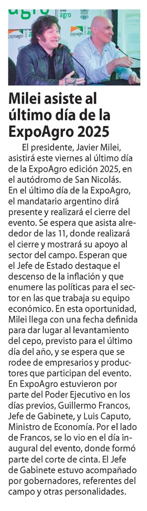 …Milei asiste al último día de la ExpoAgro 2025 El presidente, Javier Milei, asistirá este viernes al último día de la ExpoAgro edición 2025, en el autódromo de San Nicolás. En el último día…