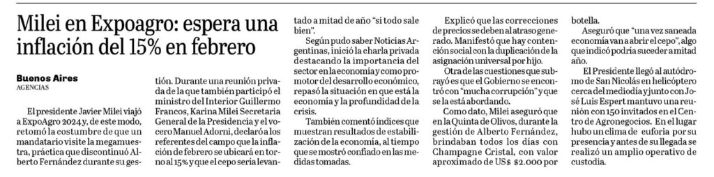 El presidente Javier Milei viajó a ExpoAgro 2024 y, de este modo, retomó la costumbre de que un mandatario visite la megamuestra, práctica que discontinuó Alberto Fernández durante su gestión.Durante una reunión privada de la que también participó el ministro del Interior Guillermo Francos, Karina Milei Secretaria General de la Presidencia y el vocero Manuel Adorni, declaró a los referentes del campo que la inflación de febrero se ubicará en torno al 15% y que el cepo sería levantado a mitad de año «si todo sale bien».Según pudo saber Noticias Argentinas, inició la charla privada destacando la importancia del sector en la economía y como promotor del desarrollo económico, repasó la situación en que está la economía y la profundidad de la crisis.También comentó índices que muestran resultados de estabilización de la economía, al tiempo que se mostró confiado en las medidas tomadas.Explicó que las correcciones de precios se deben al atraso generado.Manifestó que hay contención social con la duplicación de la asignación universal por hijo.Otra de las cuestiones que subrayó es que el Gobierno se encontró con «mucha corrupción» y que se la está abordando.Como dato, Milei aseguró que en la Quinta de Olivos, durante la gestión de Alberto Fernández, brindaban todos los días con Champagne Cristal, con valor aproximado de US$ $2.000 por botella.Aseguró que «una vez saneada economía van a abrir el cepo», algo que indicó podría suceder a mitad año.El Presidente llegó al autódromo de San Nicolás en helicóptero cerca del mediodía y junto con José Luis Espert mantuvo una reunión con 150 invitados en el Centro de Agronegocios. En el lugar hubo un clima de euforia por su presencia y antes de su llegada se realizó un amplio operativo de custodia.