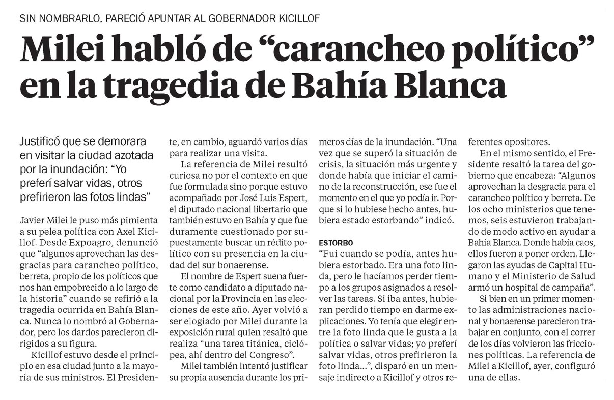 …Javier Milei le puso más pimienta a su pelea política con Axel Kicillof. Desde Expoagro, denunció que «algunos aprovechan las desgracias para carancheo político, berreta, propio de los políticos que nos han empobrecido a lo largo de la historia»…