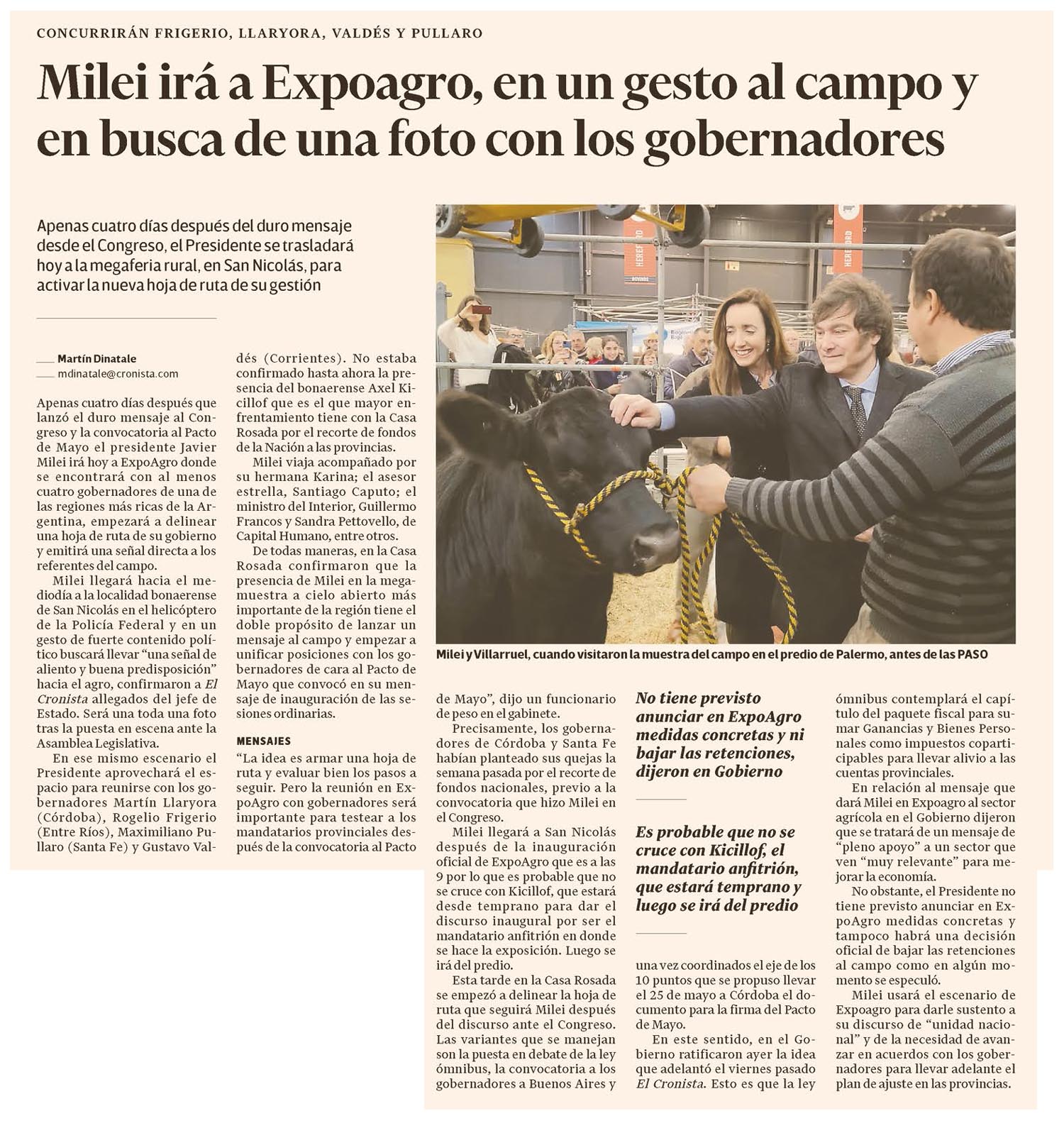 Apenas cuatro días después del duro mensaje desde el Congreso, el Presidente se trasladará hoy a la megaferia rural, en San Nicolás, para activar la nueva hoja de ruta de su gestiónApenas cuatro días después que lanzó el duro mensaje al Congreso y la convocatoria al Pacto de Mayo el presidente Javier Milei irá hoy a ExpoAgro donde se encontrará con al menos cuatro gobernadores de una de las regiones más ricas de la Argentina, empezará a delinear una hoja de ruta de su gobierno y emitirá una señal directa a los referentes del campo.Milei llegará hacia el mediodía a la localidad bonaerense de San Nicolás en el helicóptero de la Policía Federal y en un gesto de fuerte contenido político buscará llevar «una señal de aliento y buena predisposición» hacia el agro, confirmaron a El Cronista allegados del jefe de Estado. Será una toda una foto tras la puesta en escena ante la Asamblea Legislativa.En ese mismo escenario el Presidente aprovechará el espacio para reunirse con los gobernadores Martín Llaryora (Córdoba), Rogelio Frigerio (Entre Ríos), Maximiliano Pullaro (Santa Fe) y Gustavo Valdés (Corrientes). No estaba confirmado hasta ahora la presencia del bonaerense Axel Kicillof que es el que mayor enfrentamiento tiene con la Casa Rosada por el recorte de fondos de la Nación a las provincias.Milei viaja acompañado por su hermana Karina; el asesor estrella, Santiago Caputo; el ministro del Interior, Guillermo Francos y Sandra Pettovello, de Capital Humano, entre otros.De todas maneras, en la Casa Rosada confirmaron que la presencia de Milei en la megamuestra a cielo abierto más importante de la región tiene el doble propósito de lanzar un mensaje al campo y empezar a unificar posiciones con los gobernadores de cara al Pacto de Mayo que convocó en su mensaje de inauguración de las sesiones ordinarias.MENSAJES «La idea es armar una hoja de ruta y evaluar bien los pasos a seguir. Pero la reunión en ExpoAgro con gobernadores será importante para testear a los mandatarios provinciales después de la convocatoria al Pacto de Mayo», dijo un funcionario de peso en el gabinete.Precisamente, los gobernadores de Córdoba y Santa Fe habían planteado sus quejas la semana pasada por el recorte de fondos nacionales, previo a la convocatoria que hizo Milei en el Congreso.Milei llegará a San Nicolás después de la inauguración oficial de ExpoAgro que es a las 9 por lo que es probable que no se cruce con Kicillof, que estará desde temprano para dar el discurso inaugural por ser el mandatario anfitrión en donde se hace la exposición. Luego se irá del predio.Esta tarde en la Casa Rosada se empezó a delinear la hoja de ruta que seguirá Milei después del discurso ante el Congreso.Las variantes que se manejan son la puesta en debate de la ley ómnibus, la convocatoria a los gobernadores a Buenos Aires y una vez coordinados el eje de los 10 puntos que se propuso llevar el 25 de mayo a Córdoba el documento para la firma del Pacto de Mayo.En este sentido, en el Gobierno ratificaron ayer la idea que adelantó el viernes pasado El Cronista. Esto es que la ley ómnibus contemplará el capítulo del paquete fiscal para sumar Ganancias y Bienes Personales como impuestos coparticipables para llevar alivio a las cuentas provinciales.En relación al mensaje que dará Milei en Expoagro al sector agrícola en el Gobierno dijeron que se tratará de un mensaje de «pleno apoyo» a un sector que ven «muy relevante» para mejorar la economía.No obstante, el Presidente no tiene previsto anunciar en ExpoAgro medidas concretas y tampoco habrá una decisión oficial de bajar las retenciones al campo como en algún momento se especuló.Milei usará el escenario de Expoagro para darle sustento a su discurso de «unidad nacional» y de la necesidad de avanzar en acuerdos con los gobernadores para llevar adelante el plan de ajuste en las provinciasNo tiene previsto anunciar en ExpoAgro medidas concretas y ni bajar las retenciones, dijeron en GobiernoEs probable que no se cruce con Kicillof, el mandatario anfitrión, que estará temprano y luego se irá del predioMilei y Villarruel, cuando visitaron la muestra del campo en el predio de Palermo, antes de las PASO