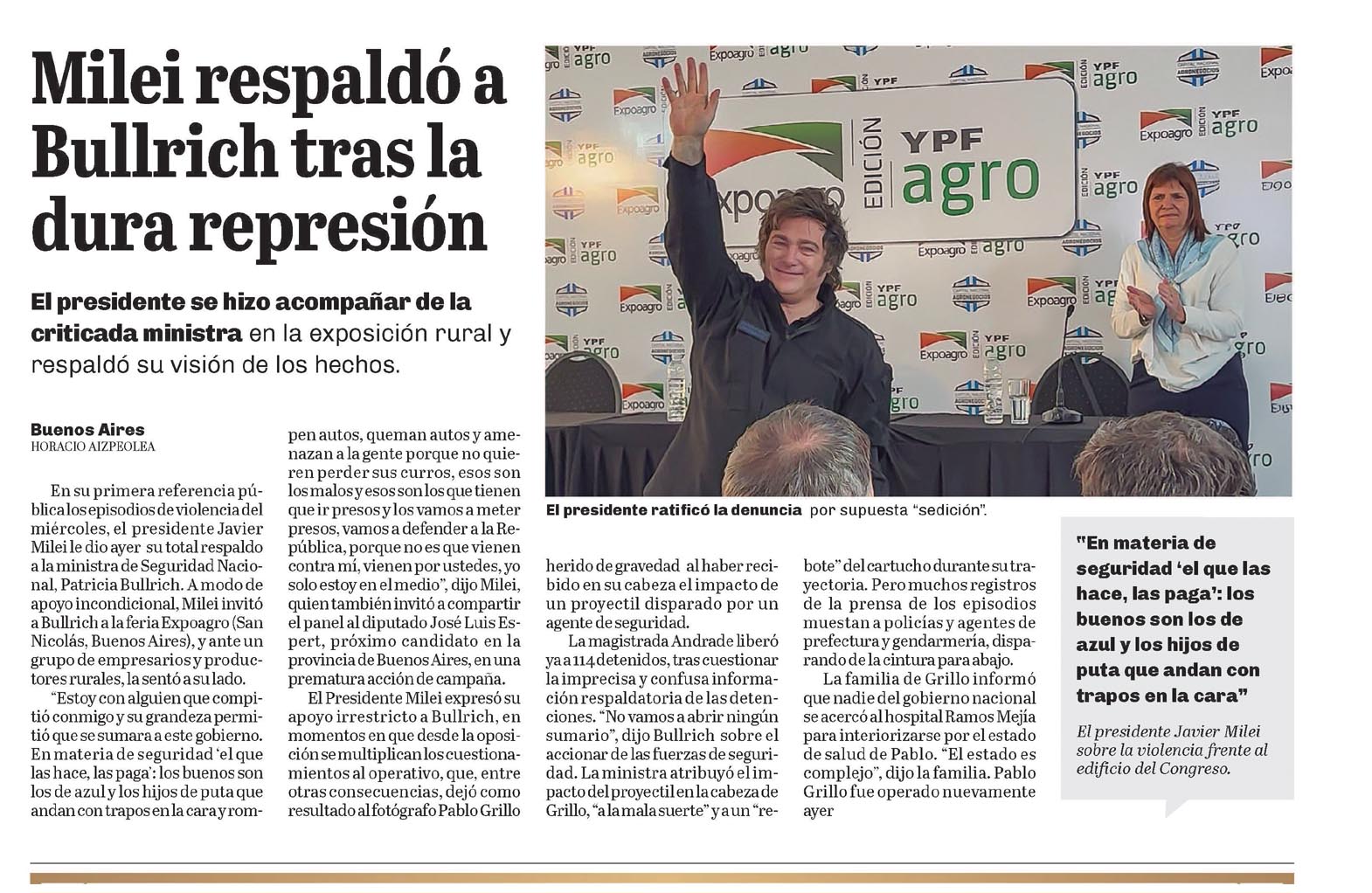 … dio ayer su total respaldo a la ministra de Seguridad Nacional, Patricia Bullrich. A modo de apoyo incondicional, Milei invitó a Bullrich a la feria Expoagro (San Nicolás, Buenos Aires), y ante un grupo de empresarios y productores rurales, la sentó a su lado. «Estoy con alguien que compitió conmigo y su grandeza…