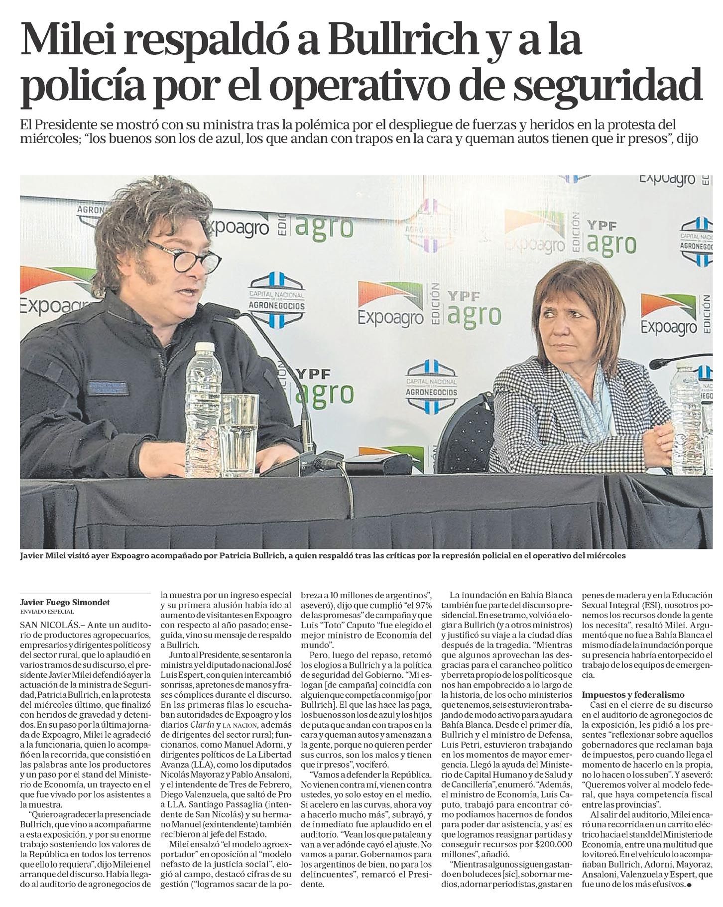 … Seguridad, Patricia Bullrich, en la protesta del miércoles último, que finalizó con heridos de gravedad y detenidos. En su paso por la última jornada de Expoagro, Milei le agradeció a la funcionaria, quien lo acompañó en la recorrida, que consistió en las palabras ante los productores y un paso por el stand del…