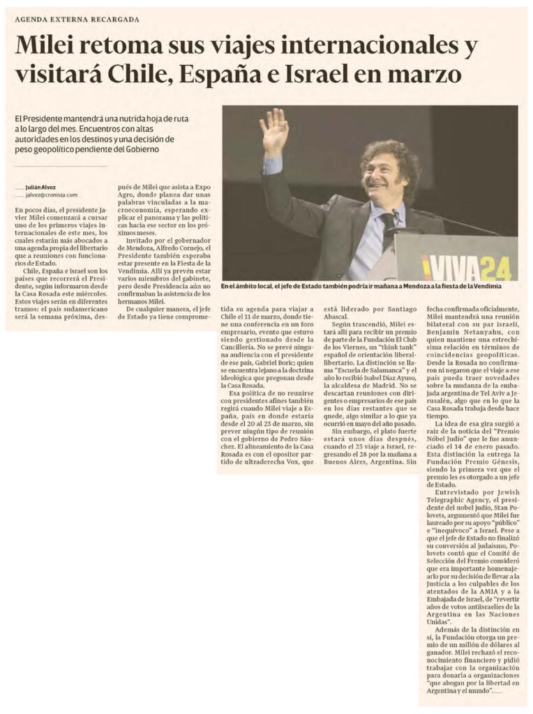 De cualquier manera, el jefe de Estado ya tiene comprometida su agenda para viajar a Chile el 11 de marzo, donde tiene una conferencia en un foro empresario, evento que estuvo siendo gestionado desde la Cancillería. No se prevé ninguna audiencia con el presidente de ese país, Gabriel Boric; quien se encuentra lejano a la doctrina ideológica que pregonan desde la Casa Rosada.