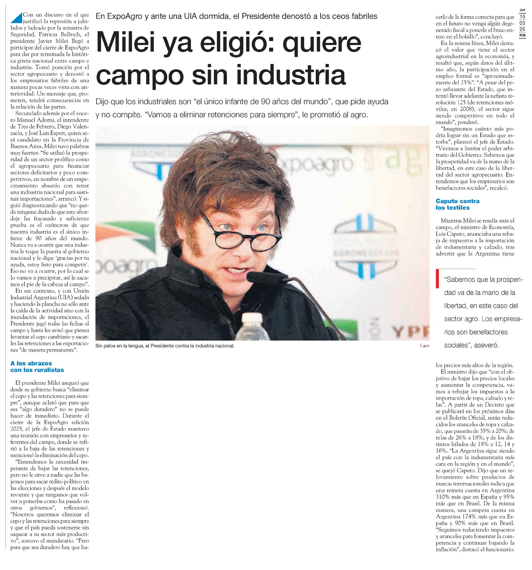 … justificó la represión a jubilados y ladeado por la ministra de Seguridad, Patricia Bullrich, el presidente Javier Milei llegó a participar del cierre de ExpoAgro para dar por terminada la histórica grieta nacional entre campo e industria. Tomó posición por el sector agropecuario y denostó a los empresarios fabriles…