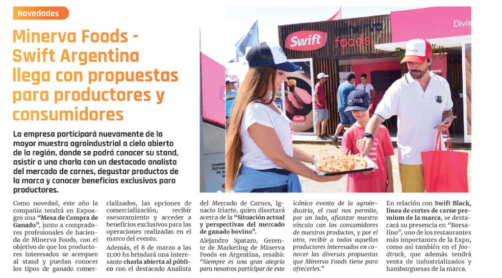 La empresa participara nuevamente de la mayor muestra agroindustrial a cielo abierto de la región, donde se podra conocer su stand, asistir a una charla con un destacado analista del mercado de carnes, degustar productos de la marca y conocer beneficios exclusivos para productores.Como novedad, este año la compañía tendrá en Expoagro una «Mesa de Compra de Ganado», junto a compradores profesionales de hacienda de Minerva Foods, con el objetivo de que los productores interesados se acerquen al stand y puedan conocer los tipos de ganado comercializados, las opciones de comercialización, recibir asesoramiento y acceder a beneficios exclusivos para las operaciones realizadas en el marco del evento.Además, el 8 de marzo a las 11:00 hs brindará una interesante charla abierta al público con el destacado Analista del Mercado de Carnes, Ignacio Iriarte, quien disertará acerca de la «Situación actual y perspectivas del mercado de ganado bovino».Alejandro Spataro, Gerente de Marketing de Minerva Foods en Argentina, resaltó: «Siempre es una gran alegría para nosotros participar de este icónico evento de la agroin- dustria, el cual nos permite, por un lado, afianzar nuestro vínculo con los consumidores de nuestros productos, y por el otro, recibir a todos aguellos productores interesados en conocer las diversas propuestas gue Minerva Foods tiene para ofrecerles.» En relación con Swift Black, línea de cortes de carne pre- mium de la marca, se destacará su presencia en «Borsa- lino», uno de los restaurantes más importantes de la Expo, como así también en el foo- dtruck, que además tendrá venta de industrializados y hamburguesas de la marca.