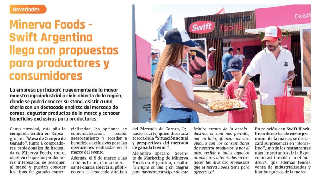 Como novedad, este año la compañía tendrá en Expoagro una «Mesa de Compra de Ganado», junto a compradores profesionales de hacienda de Minerva Foods, con el objetivo de que los productores interesados se acerquen al stand y puedan conocer los tipos de ganado comercializados, las opciones de comercialización, recibir asesoramiento y acceder a beneficios exclusivos para las operaciones realizadas en el marco del evento.