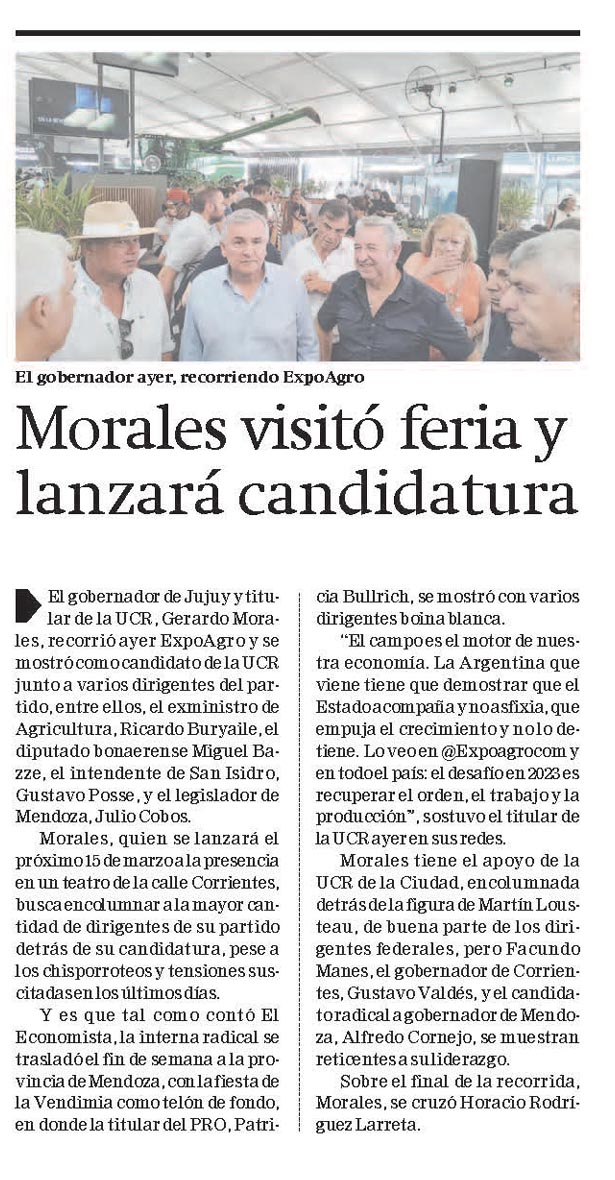 El gobernador de Jujuy y titular de la UCR, Gerardo Morales, recorrió ayer ExpoAgro y se mostró como candidato de la UCR junto a varios dirigentes del partido, entre ellos, el exministro de Agricultura, Ricardo Buryaile, el diputado bonaerense Miguel Bazze, el intendente de San Isidro, Gustavo Posse, y el legislador de Mendoza, Julio Cobos.