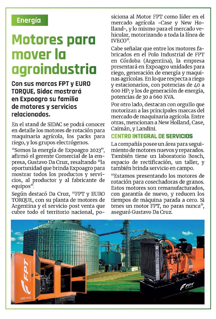 Cabe señalar que entre los motores fabricados en el Polo Industrial de FPT en Córdoba (Argentina), la empresa presentará en Expoagro unidades para riego, generación de energía y maquinas agrícolas. En lo que respecta a riego y estacionarios, con potencias de 40 a 600 HP; y los de generación de energía, potencias de 30 a 660 KVA.