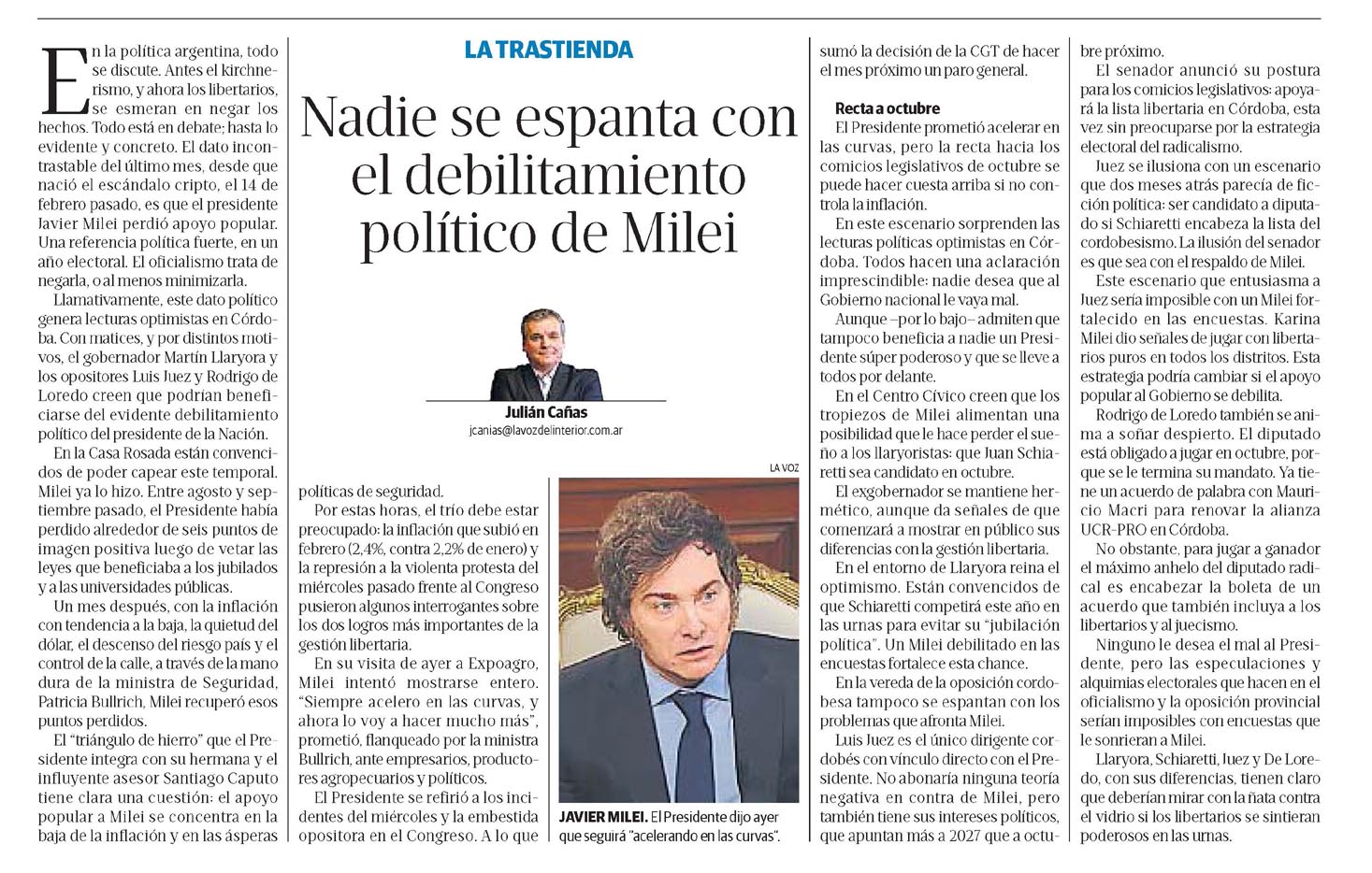 … miércoles pasado frente al Congreso pusieron algunos interrogantes sobre los dos logros más importantes de la gestión libertaria. En su visita de ayer a Expoagro, Milei intentó mostrarse entero. «Siempre acelero en las curvas, y ahora lo voy a hacer mucho más», prometió, flanqueado por la ministra Bullrich, ante…