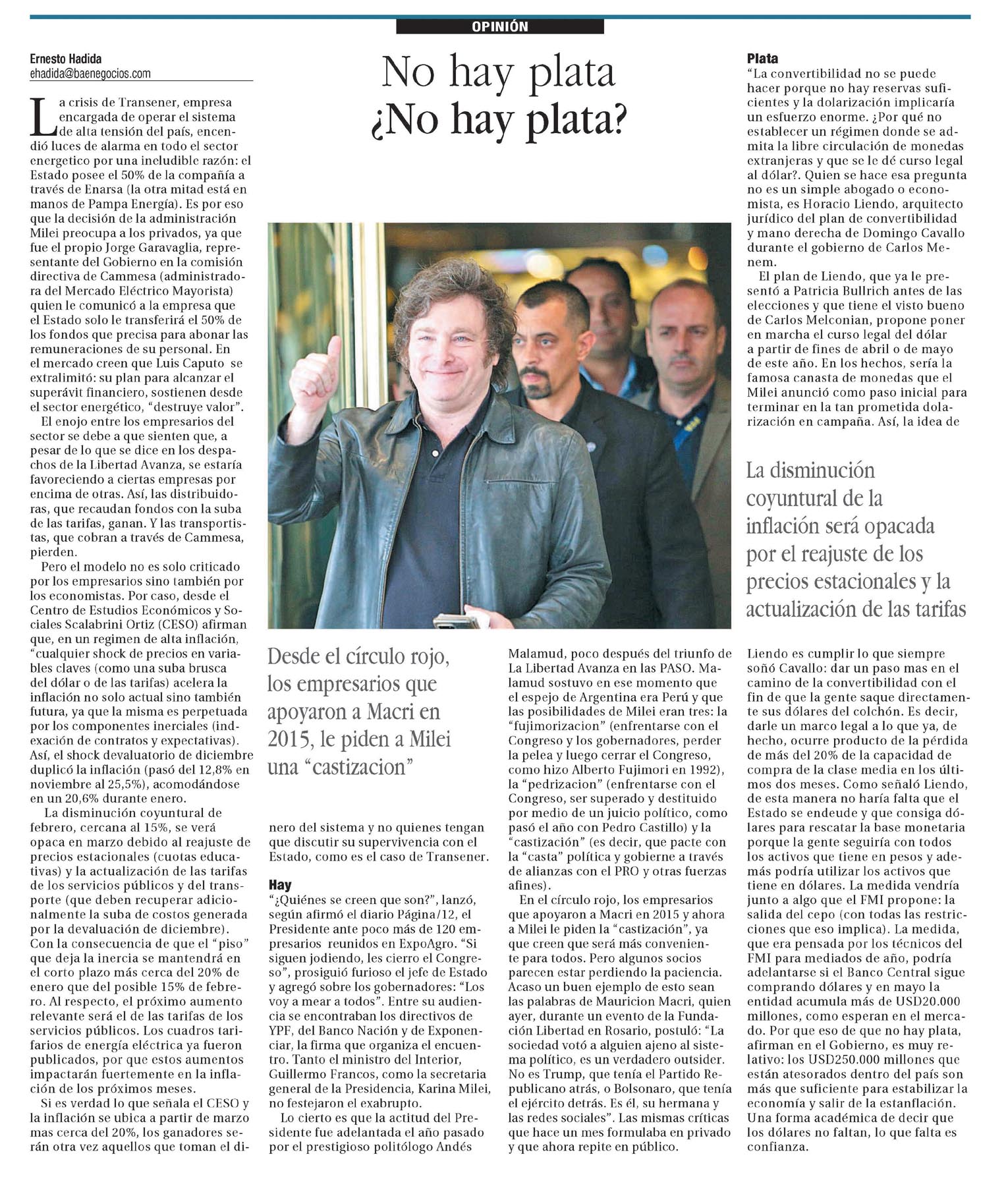 La crisis de Transener, empresa encargada de operar el sistema de alta tensión del país, encen – dió luces de alarma en todo el sector energetico por una ineludible razón: el Estado posee el 50% de la compañía a través de Enarsa (la otra mitad está en manos de Pampa Energía). Es por eso que la decisión de la administración Milei preocupa a los privados, ya que fue el propio Jorge Garavaglia, repre – sentante del Gobierno en la comisión directiva de Cammesa (administradora del Mercado Eléctrico Mayorista) quien le comunicó a la empresa que el Estado solo le transferirá el 50% de los fondos que precisa para abonar las remuneraciones de su personal. En el mercado creen que Luis Caputo se extralimitó: su plan para alcanzar el superávit financiero, sostienen desde el sector energético, «destruye valor».El enojo entre los empresarios del sector se debe a que sienten que, a pesar de lo que se dice en los despa – chos de la Libertad Avanza, se estaría favoreciendo a ciertas empresas por encima de otras. Así, las distribuido – ras, que recaudan fondos con la suba de las tarifas, ganan. Y las transportis – tas, que cobran a través de Cammesa, pierden.Pero el modelo no es solo criticado por los empresarios sino también por los economistas. Por caso, desde el Centro de Estudios Económicos y So – ciales Scalabrini Ortiz (CESO) afirman que, en un regimen de alta inflación, «cualquier shock de precios en varia – bles claves (como una suba brusca del dólar o de las tarifas) acelera la inflación no solo actual sino también futura, ya que la misma es perpetuada por los componentes inerciales (ind – exación de contratos y expectativas).Así, el shock devaluatorio de diciembre duplicó la inflación (pasó del 12,8% en noviembre al 25,5%), acomodándose en un 20,6% durante enero.La disminución coyuntural de febrero, cercana al 15%, se verá opaca en marzo debido al reajuste de precios estacionales (cuotas educa – tivas) y la actualización de las tarifas de los servicios públicos y del trans – porte (que deben recuperar adicio – nalmente la suba de costos generada por la devaluación de diciembre).Con la consecuencia de que el «piso» que deja la inercia se mantendrá en el corto plazo más cerca del 20% de enero que del posible 15% de febre – ro. Al respecto, el próximo aumento relevante será el de las tarifas de los servicios públicos. Los cuadros tari – farios de energía eléctrica ya fueron publicados, por que estos aumentos impactarán fuertemente en la infla – ción de los próximos meses.Si es verdad lo que señala el CESO y la inflación se ubica a partir de marzo mas cerca del 20%, los ganadores se – rán otra vez aquellos que toman el di – nero del sistema y no quienes tengan que discutir su supervivencia con el Estado, como es el caso de Transener.Hay «¿Quiénes se creen que son?», lanzó, según afirmó el diario Página/12, el Presidente ante poco más de 120 em – presarios reunidos en ExpoAgro. «Si siguen jodiendo, les cierro el Congre – so», prosiguió furioso el jefe de Estado y agregó sobre los gobernadores: «Los voy a mear a todos». Entre su audien – cia se encontraban los directivos de YPF, del Banco Nación y de Exponen – ciar, la firma que organiza el encuen – tro. Tanto el ministro del Interior, Guillermo Francos, como la secretaria general de la Presidencia, Karina Milei, no festejaron el exabrupto.Lo cierto es que la actitud del Pre – sidente fue adelantada el año pasado por el prestigioso politólogo Andés Malamud, poco después del triunfo de La Libertad Avanza en las PASO. Ma – lamud sostuvo en ese momento que el espejo de Argentina era Perú y que las posibilidades de Milei eran tres: la «fujimorizacion» (enfrentarse con el Congreso y los gobernadores, perder la pelea y luego cerrar el Congreso, como hizo Alberto Fujimori en 1992), la «pedrizacion» (enfrentarse con el Congreso, ser superado y destituido por medio de un juicio político, como pasó el año con Pedro Castillo) y la «castización» (es decir, que pacte con la «casta» política y gobierne a través de alianzas con el PRO y otras fuerzas afines).En el círculo rojo, los empresarios que apoyaron a Macri en 2015 y ahora a Milei le piden la «castización», ya que creen que será más convenien – te para todos. Pero algunos socios parecen estar perdiendo la paciencia.Acaso un buen ejemplo de esto sean las palabras de Mauricion Macri, quien ayer, durante un evento de la Funda – ción Libertad en Rosario, postuló: «La sociedad votó a alguien ajeno al siste – ma político, es un verdadero outsider.No es Trump, que tenía el Partido Re – publicano atrás, o Bolsonaro, que tenía el ejército detrás. Es él, su hermana y las redes sociales». Las mismas críticas que hace un mes formulaba en privado y que ahora repite en público.Plata «La convertibilidad no se puede hacer porque no hay reservas sufi – cientes y la dolarización implicaría un esfuerzo enorme. ¿Por qué no establecer un régimen donde se ad – mita la libre circulación de monedas extranjeras y que se le dé curso legal al dólar?. Quien se hace esa pregunta no es un simple abogado o econo – mista, es Horacio Liendo, arquitecto jurídico del plan de convertibilidad y mano derecha de Domingo Cavallo durante el gobierno de Carlos Me – nem.El plan de Liendo, que ya le pre – sentó a Patricia Bullrich antes de las elecciones y que tiene el visto bueno de Carlos Melconian, propone poner en marcha el curso legal del dólar a partir de fines de abril o de mayo de este año. En los hechos, sería la famosa canasta de monedas que el Milei anunció como paso inicial para terminar en la tan prometida dola – rización en campaña. Así, la idea de Liendo es cumplir lo que siempre soñó Cavallo: dar un paso mas en el camino de la convertibilidad con el fin de que la gente saque directamente sus dólares del colchón. Es decir, darle un marco lega