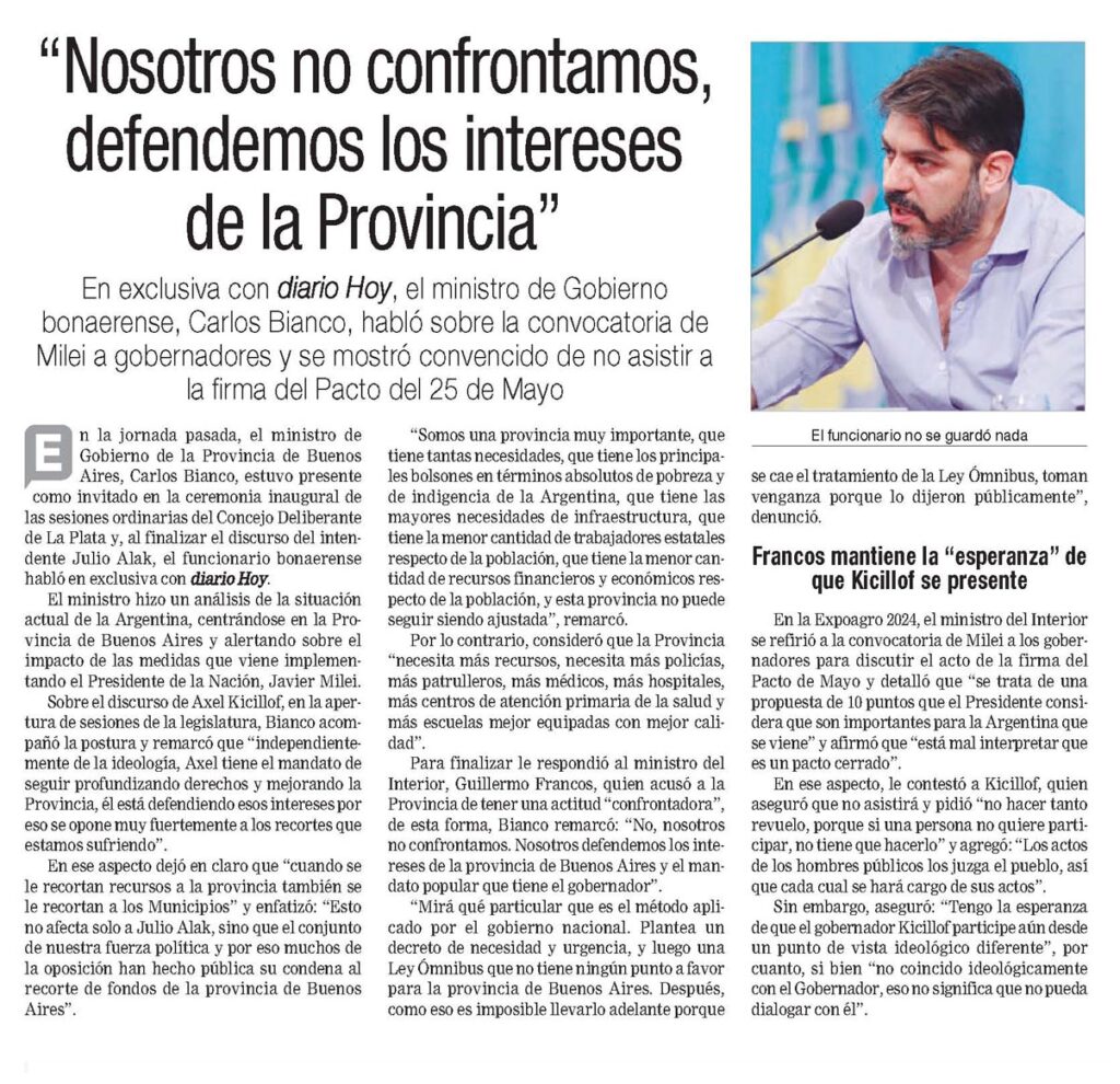 “Nosotros no confrontamos, defendemos los intereses de la Provincia”En exclusiva con diario Hoy, el ministro de Gobierno bonaerense, Carlos Bianco, habló sobre la convocatoria de Milei a gobernadores y se mostró convencido de no asistir a firma del Pacto del 25 de May la jornada pasada, el ministro de Gobierno de la Provincia de Buenos Aires, Carlos Bianco, estuvo presentomo invitado en la ceremonia inaugural de las sesiones ordinarias del Concejo Deliberante de La Plata y, al finalizar el discurso del intendente Julio Alak, el funcionario bonaerense habló en exclusiva con diario Hoy.El ministro hizo un análisis de la situación actual de la Argentina, centrándose en la Provincia de Buenos Aires y alertando sobre el impacto de las medidas que viene implementando el Presidente de la Nación, Javier Milei.Sobre el discurso de Axel Kicillof, en la apertura de sesiones de la legislatura, Bianco acompañó la postura y remarcó que “independientemente de la ideología, Axel tiene el mandato de seguir profundizando derechos y mejorando la Provincia, él está defendiendo esos intereses por eso se opone muy fuertemente a los recortes que estamos sufriendo”.En ese aspecto dejó en claro que “cuando se le recortan recursos a la provincia también se le recortan a los Municipios” y enfatizó: “Esto noafecta solo a Julio Alak, sino que el conjunto de nuestra fuerza política y por eso muchos de la oposición han hecho pública su condena al recorte de fondos de la provincia de Buenos Aires”.“Somos una provincia muy importante, que tiene tantas necesidades, que tiene los principales bolsones en términos absolutos de pobreza y de indigencia de la Argentina, que tiene las mayores necesidades de infraestructura, que tiene la menor cantidad de trabajadores estatales respecto de la población, que tiene la menor cantidad de recursos financieros y económicos respecto de la población, y esta provincia no puede seguir siendo ajustada”, remarcó.Por lo contrario, consideró que la Provincia “necesita más recursos, necesita más policías, más patrulleros, más médicos, más hospitales, más centros de atención primaria de la salud y más escuelas mejor equipadas con mejor calidad”.Para finalizar le respondió al ministro del Interior, Guillermo Francos, quien acusó a la Provincia de tener una actitud “confrontadora”, de esta forma, Bianco remarcó: “No, nosotros no confrontamos. Nosotros defendemos los intereses de la provincia de Buenos Aires y el mandato popular que tiene el gobernador”.“Mirá qué particular que es el método aplicado por el gobierno nacional. Plantea un decreto de necesidad y urgencia, y luego una Ley Ómnibus queno tiene ningún punto a favor para la provincia de Buenos Aires. Después, como eso es imposible llevarlo adelante porqueEl funcionario no se guardó nade cae el tratamiento de la Ley Ómnibus, toman venganza porque lo dijeron públicamente”, denunció.Francos mantiene la “esperanza” de que Kicillof se presenteEn la Expoagro 2024, el ministro del Interior se refirió a la convocatoria de Milei a los gobernadores para discutir el acto de la firma del Pacto de Mayo y detalló que “se trata de una propuesta de 10 puntos que el Presidente considera que son importantes para la Argentina que se viene” y afirmó que “está mal interpretar que es un pacto cerrado”.En ese aspecto, le contestó a Kicillof, quien aseguró que no asistirá y pidió “no hacer tanto revuelo, porque si una persona no quiere participar, no tiene que hacerlo” y agregó: “Los actos de los hombres públicos los juzga el pueblo, así que cada cual se hará cargo de sus actos”.Sin embargo, aseguró: “Tengo la esperanza de que el gobernador Kicillof participe aún desde un punto de vista ideológico diferente”, por cuanto, si bien “no coincido ideológicamente con el Gobernador, eso no significa que no pueda dialogar con él”.