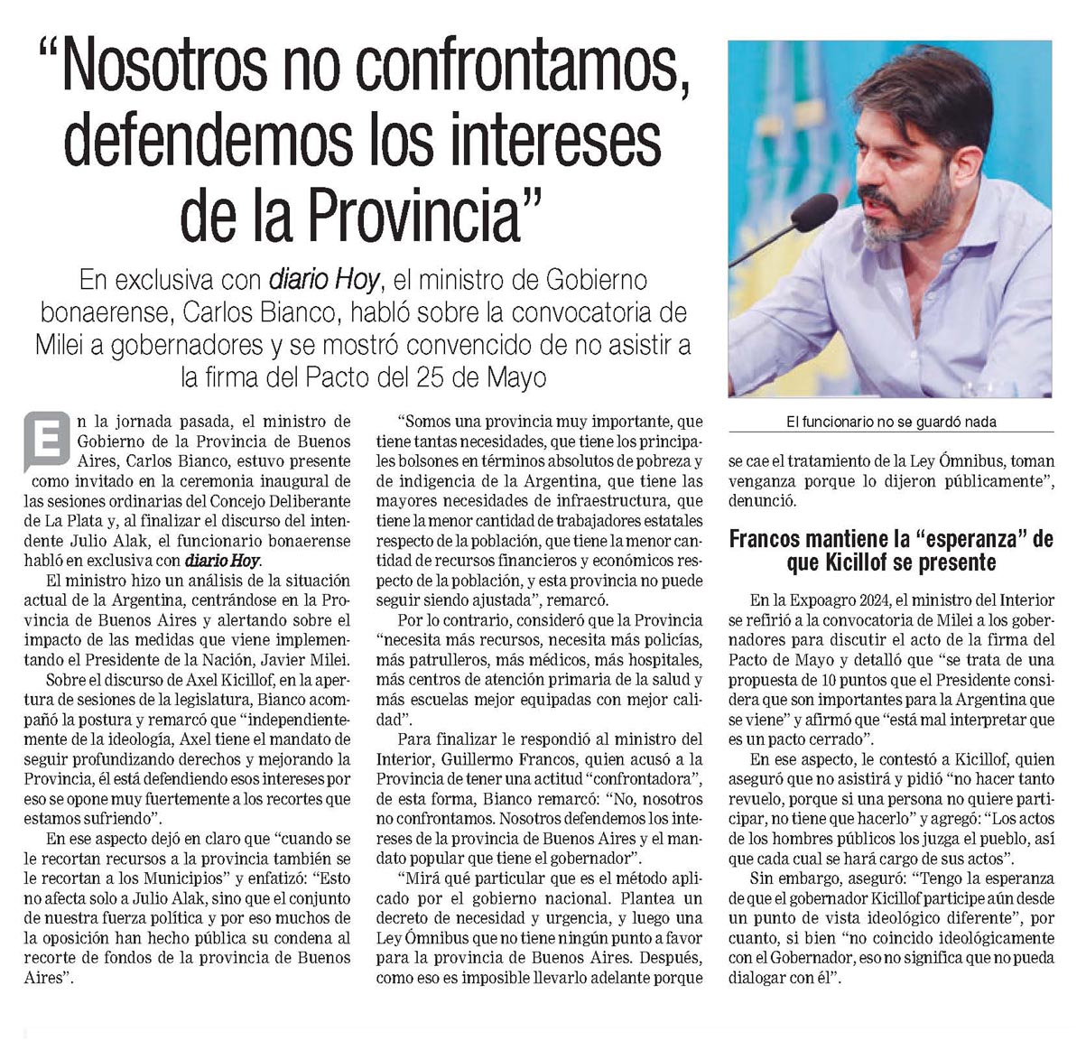 “Nosotros no confrontamos, defendemos los intereses de la Provincia”En exclusiva con diario Hoy, el ministro de Gobierno bonaerense, Carlos Bianco, habló sobre la convocatoria de Milei a gobernadores y se mostró convencido de no asistir a firma del Pacto del 25 de May la jornada pasada, el ministro de Gobierno de la Provincia de Buenos Aires, Carlos Bianco, estuvo presentomo invitado en la ceremonia inaugural de las sesiones ordinarias del Concejo Deliberante de La Plata y, al finalizar el discurso del intendente Julio Alak, el funcionario bonaerense habló en exclusiva con diario Hoy.El ministro hizo un análisis de la situación actual de la Argentina, centrándose en la Provincia de Buenos Aires y alertando sobre el impacto de las medidas que viene implementando el Presidente de la Nación, Javier Milei.Sobre el discurso de Axel Kicillof, en la apertura de sesiones de la legislatura, Bianco acompañó la postura y remarcó que “independientemente de la ideología, Axel tiene el mandato de seguir profundizando derechos y mejorando la Provincia, él está defendiendo esos intereses por eso se opone muy fuertemente a los recortes que estamos sufriendo”.En ese aspecto dejó en claro que “cuando se le recortan recursos a la provincia también se le recortan a los Municipios” y enfatizó: “Esto noafecta solo a Julio Alak, sino que el conjunto de nuestra fuerza política y por eso muchos de la oposición han hecho pública su condena al recorte de fondos de la provincia de Buenos Aires”.“Somos una provincia muy importante, que tiene tantas necesidades, que tiene los principales bolsones en términos absolutos de pobreza y de indigencia de la Argentina, que tiene las mayores necesidades de infraestructura, que tiene la menor cantidad de trabajadores estatales respecto de la población, que tiene la menor cantidad de recursos financieros y económicos respecto de la población, y esta provincia no puede seguir siendo ajustada”, remarcó.Por lo contrario, consideró que la Provincia “necesita más recursos, necesita más policías, más patrulleros, más médicos, más hospitales, más centros de atención primaria de la salud y más escuelas mejor equipadas con mejor calidad”.Para finalizar le respondió al ministro del Interior, Guillermo Francos, quien acusó a la Provincia de tener una actitud “confrontadora”, de esta forma, Bianco remarcó: “No, nosotros no confrontamos. Nosotros defendemos los intereses de la provincia de Buenos Aires y el mandato popular que tiene el gobernador”.“Mirá qué particular que es el método aplicado por el gobierno nacional. Plantea un decreto de necesidad y urgencia, y luego una Ley Ómnibus queno tiene ningún punto a favor para la provincia de Buenos Aires. Después, como eso es imposible llevarlo adelante porqueEl funcionario no se guardó nade cae el tratamiento de la Ley Ómnibus, toman venganza porque lo dijeron públicamente”, denunció.Francos mantiene la “esperanza” de que Kicillof se presenteEn la Expoagro 2024, el ministro del Interior se refirió a la convocatoria de Milei a los gobernadores para discutir el acto de la firma del Pacto de Mayo y detalló que “se trata de una propuesta de 10 puntos que el Presidente considera que son importantes para la Argentina que se viene” y afirmó que “está mal interpretar que es un pacto cerrado”.En ese aspecto, le contestó a Kicillof, quien aseguró que no asistirá y pidió “no hacer tanto revuelo, porque si una persona no quiere participar, no tiene que hacerlo” y agregó: “Los actos de los hombres públicos los juzga el pueblo, así que cada cual se hará cargo de sus actos”.Sin embargo, aseguró: “Tengo la esperanza de que el gobernador Kicillof participe aún desde un punto de vista ideológico diferente”, por cuanto, si bien “no coincido ideológicamente con el Gobernador, eso no significa que no pueda dialogar con él”.