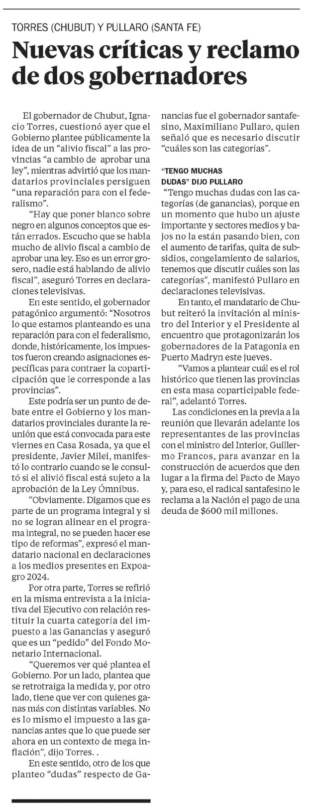 El gobernador de Chubut, Ignacio Torres, cuestionó ayer que el Gobierno plantee públicamente la idea de un «alivio fiscal» a las provincias «a cambio de aprobar una ley», mientras advirtió que los mandatarios provinciales persiguen «una reparación para con el federalismo».«Hay que poner blanco sobre negro en algunos conceptos que están errados. Escucho que se habla mucho de alivio fiscal a cambio de aprobar una ley. Eso es un error grosero, nadie está hablando de alivio fiscal», aseguró Torres en declaraciones televisivas.En este sentido, el gobernador patagónico argumentó: «Nosotros lo que estamos planteando es una reparación para con el federalismo, donde, históricamente, los impuestos fueron creando asignaciones específicas para contraer la coparticipación que le corresponde a las provincias».Este podría ser un punto de debate entre el Gobierno y los mandatarios provinciales durante la reunión que está convocada para este viernes en Casa Rosada, ya que el presidente, Javier Milei, manifestó lo contrario cuando se le consultó si el alivió fiscal está sujeto a la aprobación de la Ley Ómnibus.«Obviamente. Digamos que es parte de un programa integral y si no se logran alinear en el programa integral, no se pueden hacer ese tipo de reformas», expresó el mandatario nacional en declaraciones a los medios presentes en Expoagro 2024.Por otra parte, Torres se refirió en la misma entrevista a la iniciativa del Ejecutivo con relación restituir la cuarta categoría del impuesto a las Ganancias y aseguró que es un «pedido» del Fondo Monetario Internacional.«Queremos ver qué plantea el Gobierno. Por un lado, plantea que se retrotraiga la medida y, por otro lado, tiene que ver con quienes ganas más con distintas variables. No es lo mismo el impuesto a las ganancias antes que lo que puede ser ahora en un contexto de mega inflación», dijo Torres. .En este sentido, otro de los que planteo «dudas» respecto de Ganancias fue el gobernador santafesino, Maximiliano Pullaro, quien señaló que es necesario discutir «cuáles son las categorías».«TENGO MUCHAS DUDAS» DIJO PULLARO «Tengo muchas dudas con las categorías (de ganancias), porque en un momento que hubo un ajuste importante y sectores medios y bajos no la están pasando bien, con el aumento de tarifas, quita de subsidios, congelamiento de salarios, tenemos que discutir cuáles son las categorías», manifestó Pullaro en declaraciones televisivas.En tanto, el mandatario de Chubut reiteró la invitación al ministro del Interior y el Presidente al encuentro que protagonizarán los gobernadores de la Patagonia en Puerto Madryn este jueves.«Vamos a plantear cuál es el rol histórico que tienen las provincias en esta masa coparticipable federal», adelantó Torres.Las condiciones en la previa a la reunión que llevarán adelante los representantes de las provincias con el ministro del Interior, Guillermo Francos, para avanzar en la construcción de acuerdos que den lugar a la firma del Pacto de Mayo y, para eso, el radical santafesino le reclama a la Nación el pago de una deuda de $600 mil millones