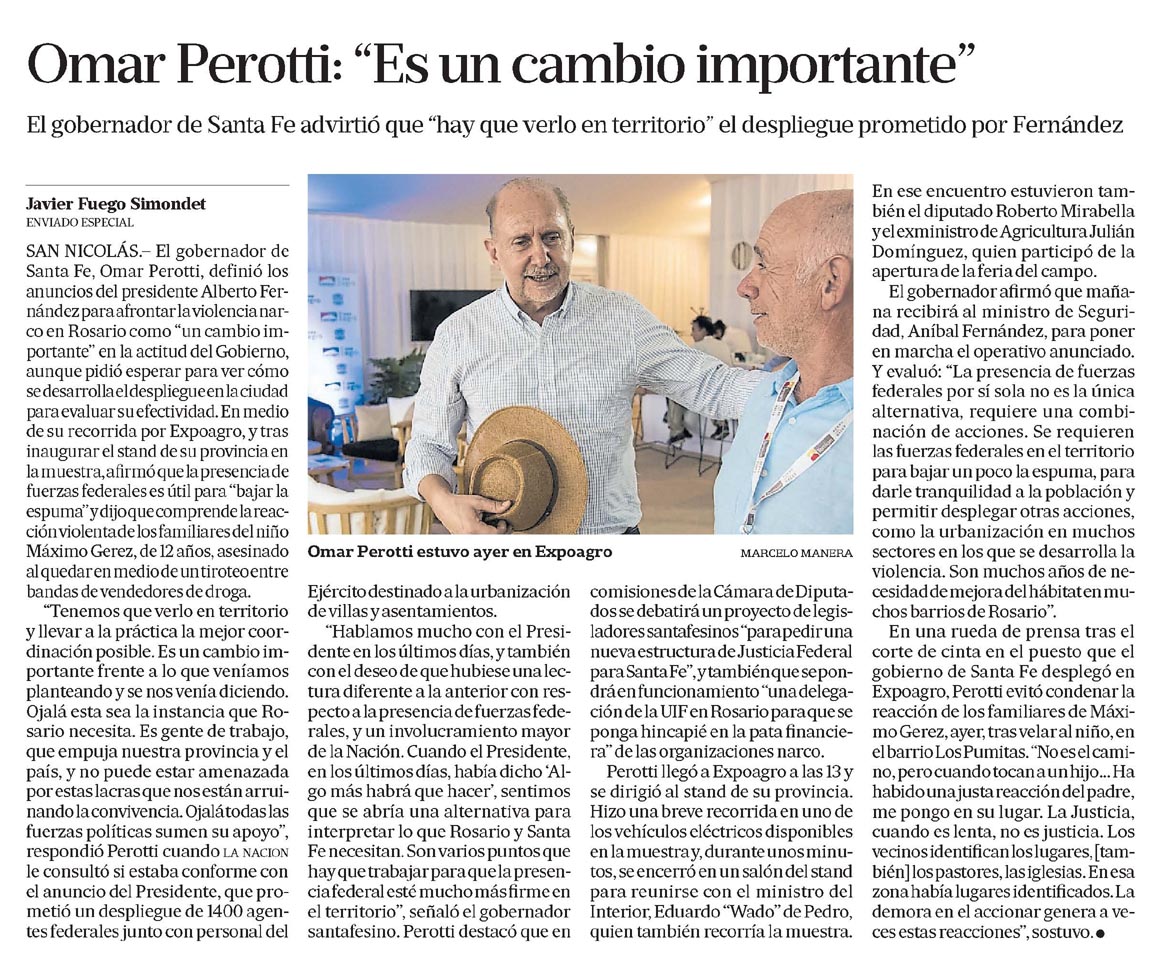 SAN NICOLÁS.? El gobernador de Santa Fe, Omar Perotti, definió los anuncios del presidente Alberto Fernández para afrontar la violencia narco en Rosario como «un cambio importante» en la actitud del Gobierno, aunque pidió esperar para ver cómo se desarrolla el despliegue en la ciudad para evaluar su efectividad. En medio de su recorrida por Expoagro, y tras inaugurar el stand de su provincia en la muestra, afirmó que la presencia de fuerzas federales es útil para «bajar la espuma» y dijo que comprende la reacción violenta de los familiares del niño Máximo Gerez, de 12 años, asesinado al quedar en medio de un tiroteo entre bandas de vendedores de droga.