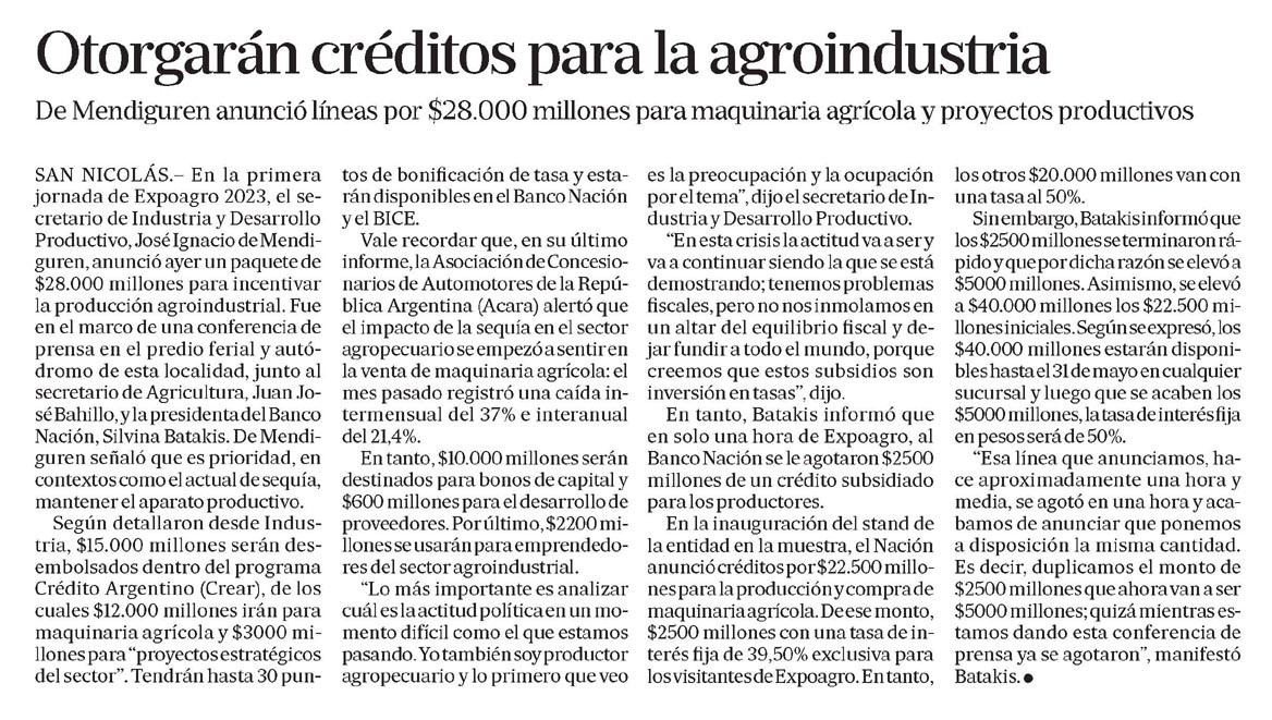 SAN NICOLÁS.? En la primera jornada de Expoagro 2023, el secretario de Industria y Desarrollo Productivo, José Ignacio de Mendiguren, anunció ayer un paquete de $28.000 millones para incentivar la producción agroindustrial. Fue en el marco de una conferencia de prensa en el predio ferial y autódromo de esta localidad, junto al secretario de Agricultura, Juan José Bahillo, y la presidenta del Banco Nación, Silvina Batakis. De Mendiguren señaló que es prioridad, en contextos como el actual de sequía, mantener el aparato productivo.