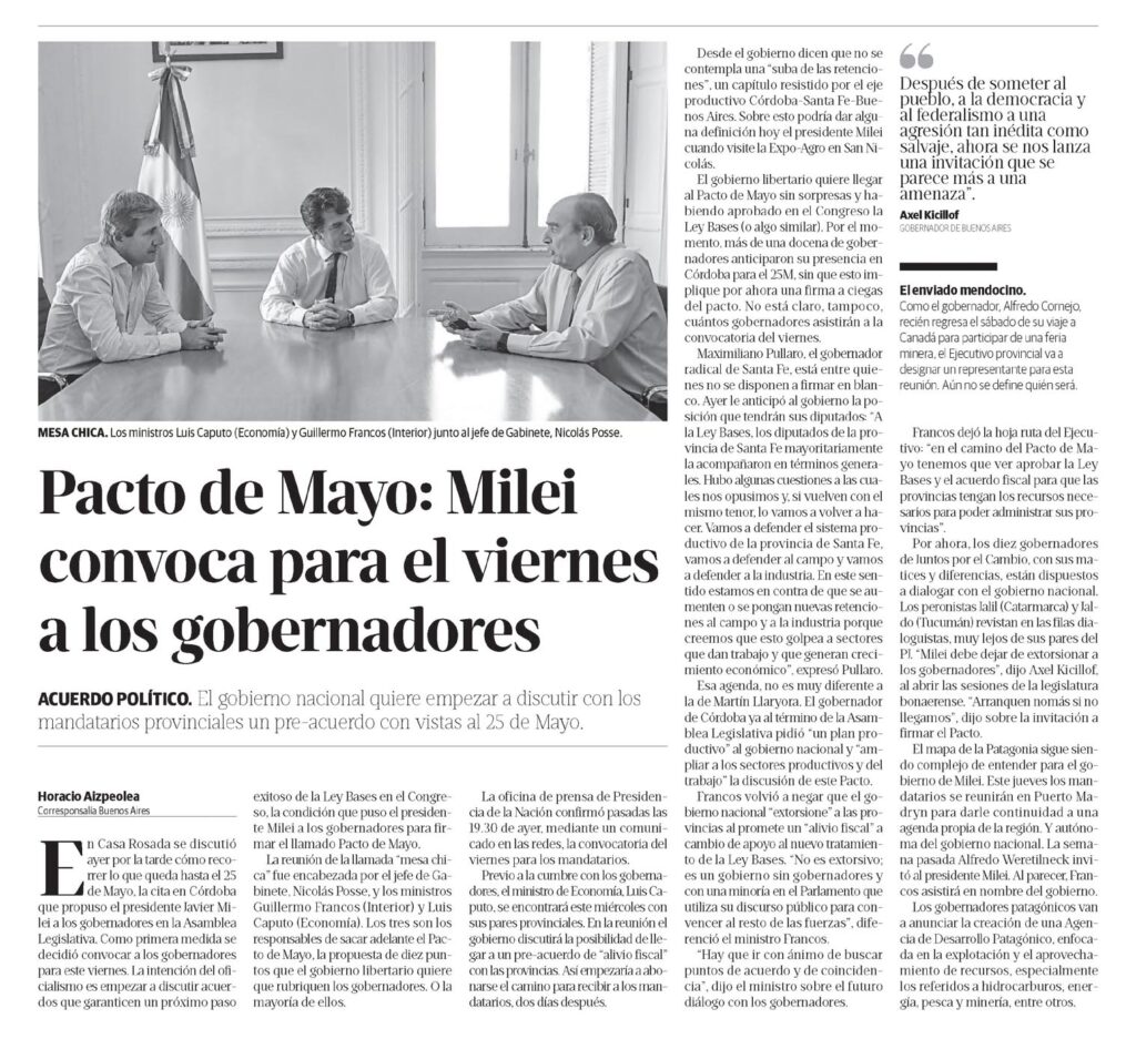 ACUERDO POLÍTICO. El gobierno nacional quiere empezar a discutir con los mandatarios provinciales un pre-acuerdo con vistas al 25 de Mayo.Corresponsalía Buenos AiresEn Casa Rosada se discutió ayer por la tarde cómo recorrer lo que queda hasta el 25 de Mayo, la cita en Córdoba que propuso el presidente Javier Milei a los gobernadores en la Asamblea Legislativa. Como primera medida se decidió convocar a los gobernadores para este viernes. La intención del oficialismo es empezar a discutir acuerdos que garanticen un próximo paso exitoso de la Ley Bases en el Congreso, la condición que puso el presidente Milei a los gobernadores para firmar el llamado Pacto de Mayo.La reunión de la llamada «mesa chica» fue encabezada por el jefe de Gabinete, Nicolás Posse, y los ministros Guillermo Francos (Interior) y Luis Caputo (Economía). Los tres son los responsables de sacar adelante el Pacto de Mayo, la propuesta de diez puntos que el gobierno libertario quiere que rubriquen los gobernadores. O la mayoría de ellos.La oficina de prensa de Presidencia de la Nación confirmó pasadas las 19.30 de ayer, mediante un comunicado en las redes, la convocatoria del viernes para los mandatarios.Previo a la cumbre con los gobernadores, el ministro de Economía, Luis Caputo, se encontrará este miércoles con sus pares provinciales. En la reunión el gobierno discutirá la posibilidad de llegar a un pre-acuerdo de «alivio fiscal» con las provincias. Así empezaría a abonarse el camino para recibir a los mandatarios, dos días después.Desde el gobierno dicen que no se contempla una «suba de las retenciones», un capítulo resistido por el eje productivo Córdoba-Santa Fe-Buenos Aires. Sobre esto podría dar alguna definición hoy el presidente Milei cuando visite la Expo-Agro en San Nicolás.El gobierno libertario quiere llegar al Pacto de Mayo sin sorpresas y habiendo aprobado en el Congreso la Ley Bases (o algo similar). Por el momento, más de una docena de gobernadores anticiparon su presencia en Córdoba para el 25M, sin que esto implique por ahora una firma a ciegas del pacto. No está claro, tampoco, cuántos gobernadores asistirán a la convocatoria del viernes.Maximiliano Pullaro, el gobernador radical de Santa Fe, está entre quienes no se disponen a firmar en blanco.Ayer le anticipó al gobierno la posición que tendrán sus diputados: «A la Ley Bases, los diputados de la provincia de Santa Fe mayoritariamente la acompañaron en términos generales.Hubo algunas cuestiones a las cuales nos opusimos y, si vuelven con el mismo tenor, lo vamos a volver a hacer.Vamos a defender el sistema productivo de la provincia de Santa Fe, vamos a defender al campo y vamos a defender a la industria. En este sentido estamos en contra de que se aumenten o se pongan nuevas retenciones al campo y a la industria porque creemos que esto golpea a sectores que dan trabajo y que generan crecimiento económico», expresó Pullaro.Esa agenda, no es muy diferente a la de Martín Llaryora. El gobernador de Córdoba ya al término de la Asamblea Legislativa pidió «un plan productivo» al gobierno nacional y «ampliar a los sectores productivos y del trabajo» la discusión de este Pacto.Francos volvió a negar que el gobierno nacional «extorsione» a las provincias al promete un «alivio fiscal» a cambio de apoyo al nuevo tratamiento de la Ley Bases. «No es extorsivo; es un gobierno sin gobernadores y con una minoría en el Parlamento que utiliza su discurso público para convencer al resto de las fuerzas», diferenció el ministro Francos.»Hay que ir con ánimo de buscar puntos de acuerdo y de coincidencia», dijo el ministro sobre el futuro diálogo con los gobernadores.Francos dejó la hoja ruta del Ejecutivo: «en el camino del Pacto de Mayo tenemos que ver aprobar la Ley Bases y el acuerdo fiscal para que las provincias tengan los recursos necesarios para poder administrar sus provincias».Por ahora, los diez gobernadores de Juntos por el Cambio, con sus matices y diferencias, están dispuestos a dialogar con el gobierno nacional.Los peronistas Jalil (Catarmarca) y Jaldo (Tucumán) revistan en las filas dialoguistas, muy lejos de sus pares del PJ. «Milei debe dejar de extorsionar a los gobernadores», dijo Axel Kicillof, al abrir las sesiones de la legislatura bonaerense. «Arranquen nomás si no llegamos», dijo sobre la invitación a firmar el Pacto.El mapa de la Patagonia sigue siendo complejo de entender para el gobierno de Milei. Este jueves los mandatarios se reunirán en Puerto Madryn para darle continuidad a una agenda propia de la región. Y autónoma del gobierno nacional. La semana pasada Alfredo Weretilneck invitó al presidente Milei. Al parecer, Francos asistirá en nombre del gobierno.Los gobernadores patagónicos van a anunciar la creación de una Agencia de Desarrollo Patagónico, enfocada en la explotación y el aprovechamiento de recursos, especialmente los referidos a hidrocarburos, energía, pesca y minería, entre otros.Después de someter al pueblo, a la democracia y al federalismo a una agresión tan inédita como salvaje, ahora se nos lanza una invitación que se parece más a una amenaza».Axel Kicillof GOBERNADOR DE BUENOS AIRESEl enviado mendocino.Como el gobernador, Alfredo Cornejo, recién regresa el sábado de su viaje a Canadá para participar de una feria minera, el Ejecutivo provincial va a designar un representante para esta reunión. Aún no se define quién será.