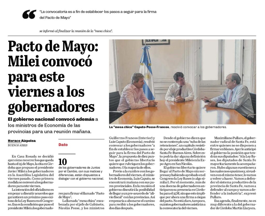 La llamada «mesa chica» encabezada por el jefe de Gabinete, Nicolás Posse, y los ministros Guillermo Francos (Interior) y Luis Caputo (Economía), resolvió convocar a los gobernadores «a fin de establecer los pasos a seguir para la firma del Pacto de Mayo», la propuesta de diez puntos que el gobierno libertario quiere que rubriquen los gobernadores.