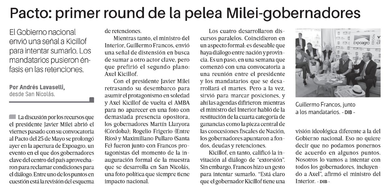Con el presidente Javier Milei retrasando su desembarco para asumir el protagonismo en soledad y Axel Kicillof de vuelta el AMBA para no aparecer en una foto con demasiada presencia opositora, los gobernadores Martín Llaryora (Córdoba); Rogelio Frigerio (Entre Ríos) y Maximiliano Pullaro (Santa Fe) fueron junto con Francos protagonistas del momento de la in auguración formal de la muestra que se desarrolla en San Nicolás, una foto política que siempre tiene impacto nacional.