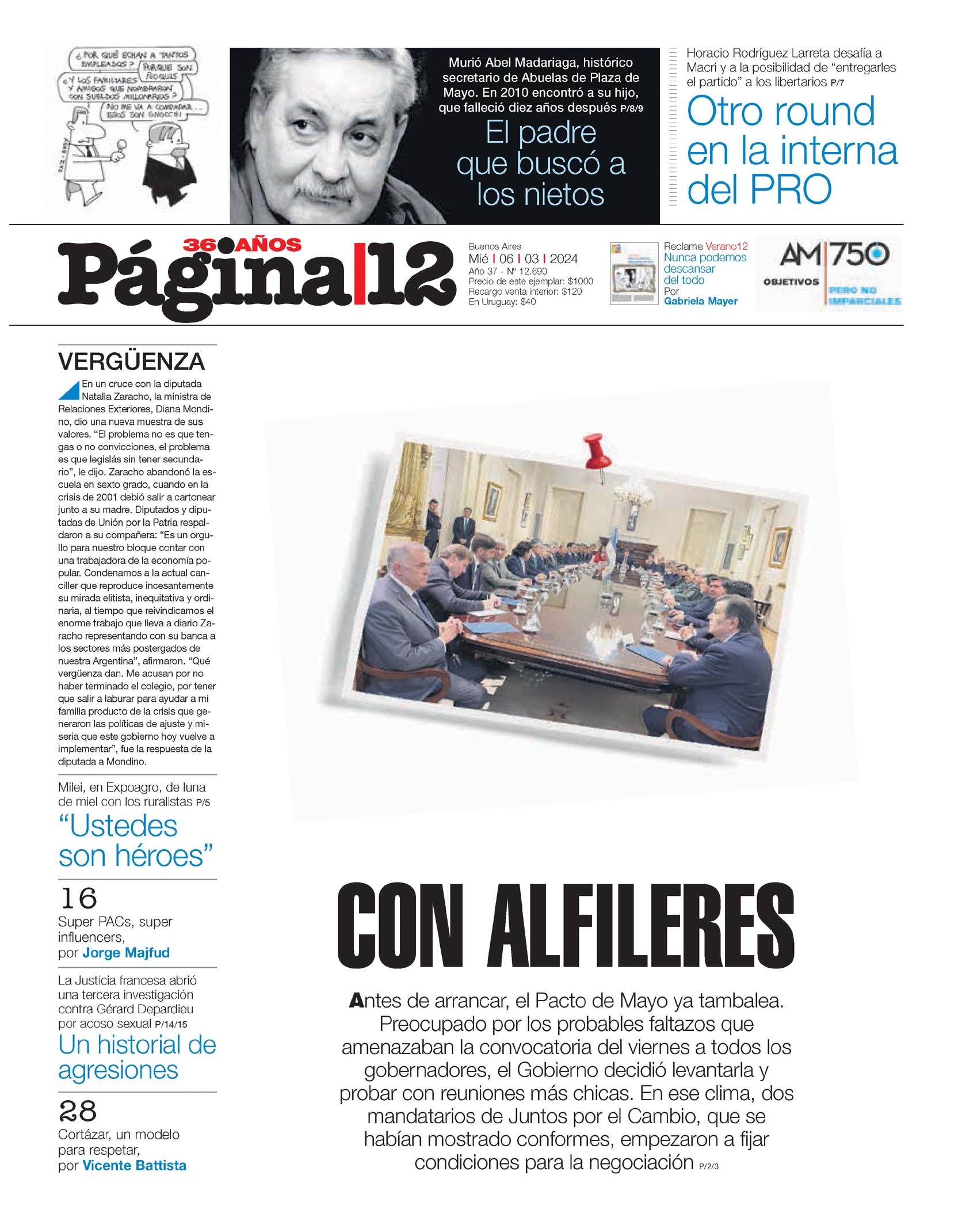 Murió Abel Madariaga, histórico secretario de Abuelas de Plaza de Mayo. En 2010 encontró a su hijo, que falleció diez años después P/8/9 El padre que buscó a los nietosHoracio Rodríguez Larreta desafía a Macri y a la posibilidad de «entregarles el partido» a los libertarios P/7 Otro round en la interna del PROVERGÜENZA En un cruce con la diputada Natalia Zaracho, la ministra de Relaciones Exteriores, Diana Mondino, dio una nueva muestra de sus valores. «El problema no es que tengas o no convicciones, el problema es que legislás sin tener secundario», le dijo. Zaracho abandonó la escuela en sexto grado, cuando en la crisis de 2001 debió salir a cartonear junto a su madre. Diputados y diputadas de Unión por la Patria respaldaron a su compañera: «Es un orgullo para nuestro bloque contar con una trabajadora de la economía popular.Condenamos a la actual canciller que reproduce incesantemente su mirada elitista, inequitativa y ordinaria, al tiempo que reivindicamos el enorme trabajo que lleva a diario Zaracho representando con su banca a los sectores más postergados de nuestra Argentina», afirmaron. «Qué vergüenza dan. Me acusan por no haber terminado el colegio, por tener que salir a laburar para ayudar a mi familia producto de la crisis que generaron las políticas de ajuste y miseria que este gobierno hoy vuelve a implementar», fue la respuesta de la diputada a Mondino.Milei, en Expoagro, de luna de miel con los ruralistas P/5 «Ustedes son héroes»16 Super PACs, super influencers, por Jorge MajfudLa Justicia francesa abrió una tercera investigación contra Gérard Depardieu por acoso sexual P/14/15 Un historial de Agresiones28 Cortázar, un modelo para respetar, por Vicente BattistaCON ALFILERES Antes de arrancar, el Pacto de Mayo ya tambalea.Preocupado por los probables faltazos que amenazaban la convocatoria del viernes a todos los gobernadores, el Gobierno decidió levantarla y probar con reuniones más chicas. En ese clima, dos mandatarios de Juntos por el Cambio, que se habían mostrado conformes, empezaron a fijar condiciones para la negociación P/2/3