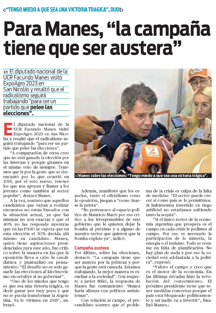 El diputado nacional de la UCR Facundo Manes visitó ExpoAgro 2023 en San Nicolás y resaltó que el radicalismo seguirá trabajando «para ser un partido que pelee las elecciones».