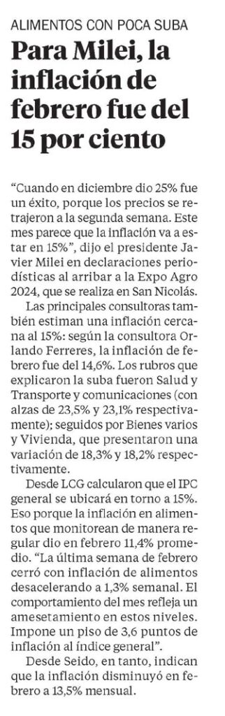 Las principales consultoras también estiman una inflación cercana al 15%: según la consultora Orlando Ferreres, la inflación de febrero fue del 14,6%. Los rubros que explicaron la suba fueron Salud y Transporte y comunicaciones (con alzas de 23,5% y 23,1% respectivamente); seguidos por Bienes varios y Vivienda, que presentaron una variación de 18,3% y 18,2% respectivamente.