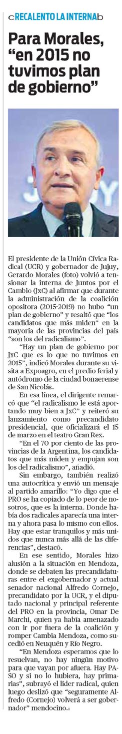 En ese sentido, Morales hizo alusión a la situación en Mendoza, donde se debaten las precandidaturas entre el exgobernador y actual senador nacional Alfredo Cornejo, precandidato por la UCR, y el diputado nacional y principal referente del PRO en la provincia, Omar De Marchi, quien ya había amenazado con ir por fuera de la coalición y romper Cambia Mendoza, como sucedió en Neuquén y Río Negro.