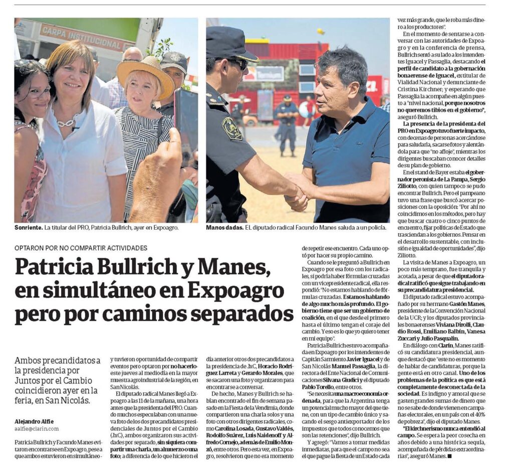 El diputado radical Manes llegó a Expoagro a las 11 de la mañana, una hora antes que la presidenta del PRO. Cuando muchos especulaban con una nueva foto de los dos precandidatos presidenciales de Juntos por el Cambio (JxC), ambos organizaron sus actividades por separado, sin siquiera compartir una charla, un almuerzo o una foto; a diferencia de lo que hicieron el día anterior otros dos precandidatos a la presidencia de JxC, Horacio Rodríguez Larreta y Gerardo Morales, que se sacaron una foto y organizaron para encontrarse a conversar.