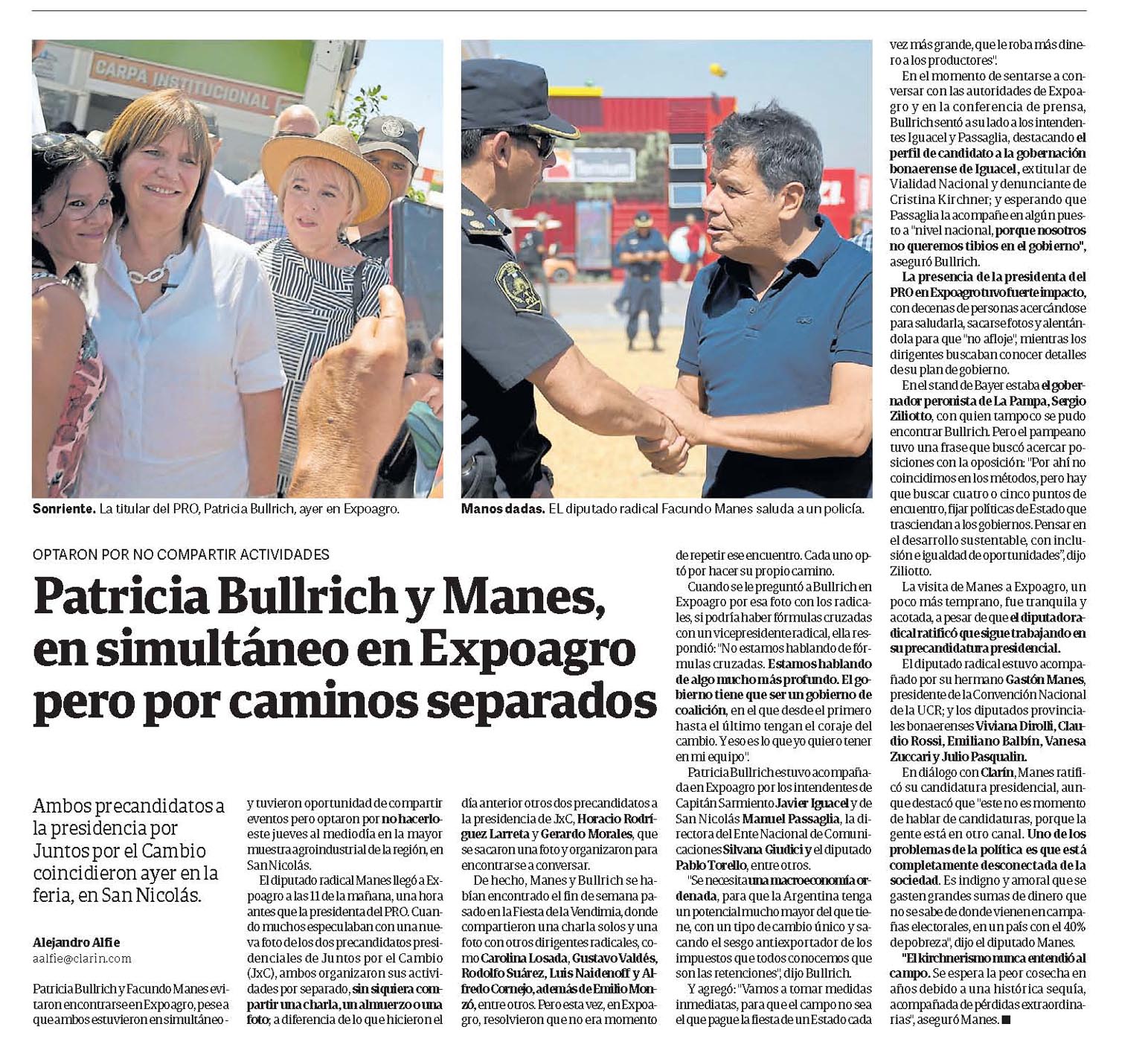 Patricia Bullrich y Facundo Manes evitaron encontrarse en Expoagro, pese a que ambos estuvieron en simultáneo y tuvieron oportunidad de compartir eventos pero optaron por no hacerloeste jueves al mediodía en la mayor muestra agroindustrial de la región, en San Nicolás.