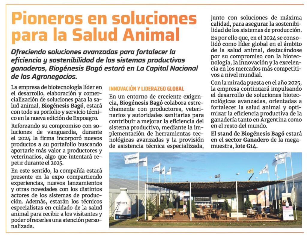 La empresa de biotecnología líder en el desarrollo, elaboración y comercialización de soluciones para la salud animal, Biogénesis Bagó, estará con todo su porfolio y servicio técnico en la nueva edición de Expoagro. Reforzando su compromiso con soluciones de vanguardia, durante el 2024 la firma incorporó nuevos productos a su portafolio buscando aportarle más valor a productores y veterinarios, algo que intentará repetir durante el 2025.