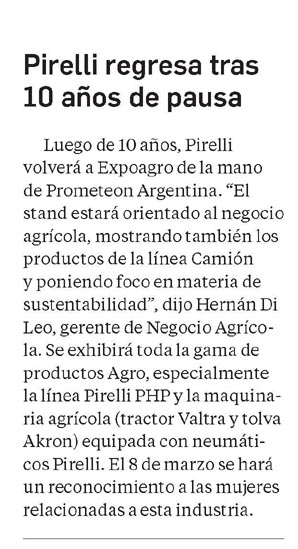 Luego de 10 años, Pirelli volverá a Expoagro de la mano de Prometeon Argentina. «El stand estará orientado al negocio agrícola, mostrando también los productos de la línea Camión y poniendo foco en materia de sustentabilidad», dijo Hernán Di Leo, gerente de Negocio Agrícola.