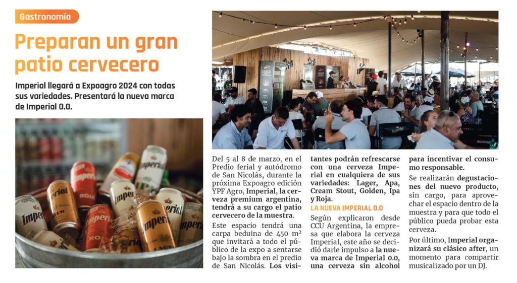 Imperial llegara a Expoagro 2024 con todas sus variedades. Presentarála nueva marca del imperial 0.0.Del 5 al 8 de marzo, en el Predio ferial y autódromo de San Nicolás, durante la próxima Expoagro edición YPF Agro, Imperial, la cerveza pre- mium argentina, tendrá a su cargo el patio cervecero de la muestra.Este espacio tendrá una carpa beduina de 450 m2 que invitará a todo el público de la expo a sentarse bajo la sombra en el predio de San Nicolás.Los visitantes podrán refrescarse con una cerveza Imperial en cualquiera de sus variedades: Lager, Apa, Cream Stout, Golden, Ipa y Roja.LA NUEVA IMPERIAL 0.0 Según explicaron desde CCU Argentina, la empresa que elabora la cerveza Imperial, este año se decidió darle impulso a la nueva marca de Imperial 0.0, una cerveza sin alcohol para incentivar el consumo responsable.Se realizarán degustaciones del nuevo producto, sin cargo, para aprovechar el espacio dentro de la muestra y para que todo el público pueda probar esta cerveza.Por último, Imperial organizará su clásico after, un momento para compartir musicalizado por un DJ.