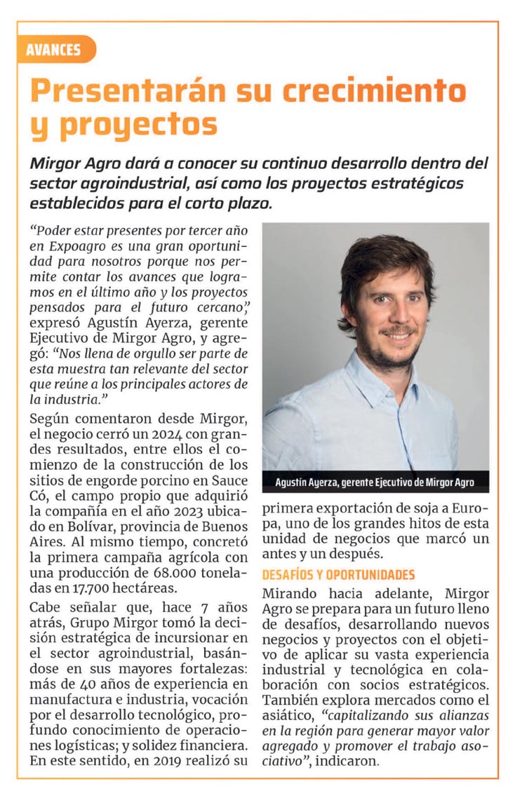 «Poder estar presentes por tercer año en Expoagro es una gran oportunidad para nosotros porque nos permite contar los avances que logramos en el último año y los proyectos pensados para el futuro cercano» expresó Agustín Ayerza, gerente Ejecutivo de Mirgor Agro, y agregó: «Nos llena de orgullo ser parte de esta muestra tan relevante del sector que reúne a los principales actores de la industria.»
