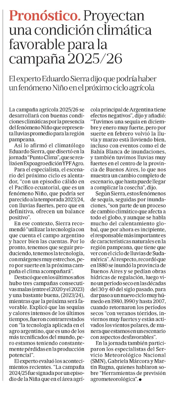 … representa lluvias promedio para la región pampeana. Así lo afirmó el climatólogo Eduardo Sierra, que disertó en la jornada «Punto Clima», que se realizó en Expoagro ediciónYPF Agro. Para el especialista, el escenario del próximo ciclo es alentador, «con un episodio cálido en el Pacífico ecuatorial, que es un fenómeno…