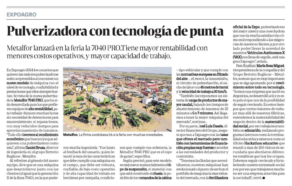 Metalfor lanzará en la feria la 7040 PRO.Tiene mayor rentabilidad con menores costos operativos, y mayor capacidad de trabajo.Metalfor. La firma cordobesa irá a la feria con muchas novedades.En Expoagro 2024 los usuarios que quieren las mejores pulverizadoras serán sorprendidos al encontrar un nuevo modelo de máquina con el nivel de tecnología, confiabilidad y prestaciones que ellos siempre buscan.Se trata de la nueva pulverizadora Metalfor 7040 PRO, que ha sido desarrollada para los que prefieren equipos de alta rentabilidad, para trabajar durante muchas horas sin necesidad de detenciones para mantenimiento ni reparaciones, con muy reducidos tiempos para aprovisionamiento de insumos.»Todo ello favorece al rendimiento económico que buscan los que adquieren una pulverizadora como esta», afirma Daniel Brusa, director de ingeniería en el grupo Bertotto Boglione – Metalfor.Al referirse al génesis del nuevo equipo, dice que es una máquina que desarrollaron junto con los clientes (al igual que la generación II de la línea 7040), en la que pusieron mucha ingeniería. «Fue junto al feedback del usuario, quien levantó la vara de las características que debe cumplir una máquina en el campo, que debe ser robusta, confiable, de bajo costo operativo y de alta capacidad de trabajo en hectáreas por campaña, condiciones que cumple con solvencia, la Metalfor 7040 PRO que es el tope de gama», especifica.Según precisó, para este modelo se mejoraron sustancialmente el tipo de suspensión, el material con que está construido el chasis, la posición de los comandos de la cabina ? tipo vehicular y que cumple con las normativas europeas en filtrado del aire–, el motor, la transmisión, el circuito de pulverización, el ancho de labor con 46 metros de barral y la velocidad de trabajo a 30 km/h.»También incorporamos un sistema de carga de productos de mayor caudal, bajando los tiempos de abastecimiento de insumos de 25 minutos a 6 o 7 minutos. Así llegamos a tener la mejor máquina del mercado», sostiene..Por su parte, José Luis Dassie, director financiero del Grupo, asegura que van a Expoagro con las tasas que ofrece el mercado pero también con herramientas de financiación propias muy fuertes y acordes a las necesidades del productor y contratista.»Tenemos las lluvias que necesitábamos, nuestras máquinas han evolucionado al punto de ser hoy el portfolio de maquinaria mas robusto del mercado, con la fertilizadora oficial de la Expo, pulverizadoras del mejor nivel y una cosechadora que nos da mucha satisfacción cómo está respondiendo a las exigencias de nuestros clientes, y por otro lado poder llevar la novedad de nuestros Vehículos Autónomos X (VAX) nos llena de orgullo, será una gran Expoagro«, señala..Para finalizar, María Rosa Miguel, vicepresidenta de la compañía y del Grupo Bertotto Boglione ? Metalfor, sostuvo que es muy importante que se siga apostando por el crecimiento sobre todo en tecnología.»Somos una empresa que nació en Argentina, se desarrolló acá y es este país el que nos da la posibilidad de seguir creciendo. En estos tiempos que corren tratamos de trabajar mas allá de nuestras fábricas, entendemos la sustentabilidad del negocio dentro de la sustentabilidad social, por eso trabajamos también en educación, realizando programas internos como la terminalidad educativa y externos como el último Hackathon educativo que reunió a mas de 200 chicos de secundaria que abordaron diferentes temáticas que hoy los ocupan.Debemos seguir creciendo y fortaleciendo nuestro entramado social y es por eso que trabajamos mucho en ser una empresa atractiva para la sociedadl», cerró.