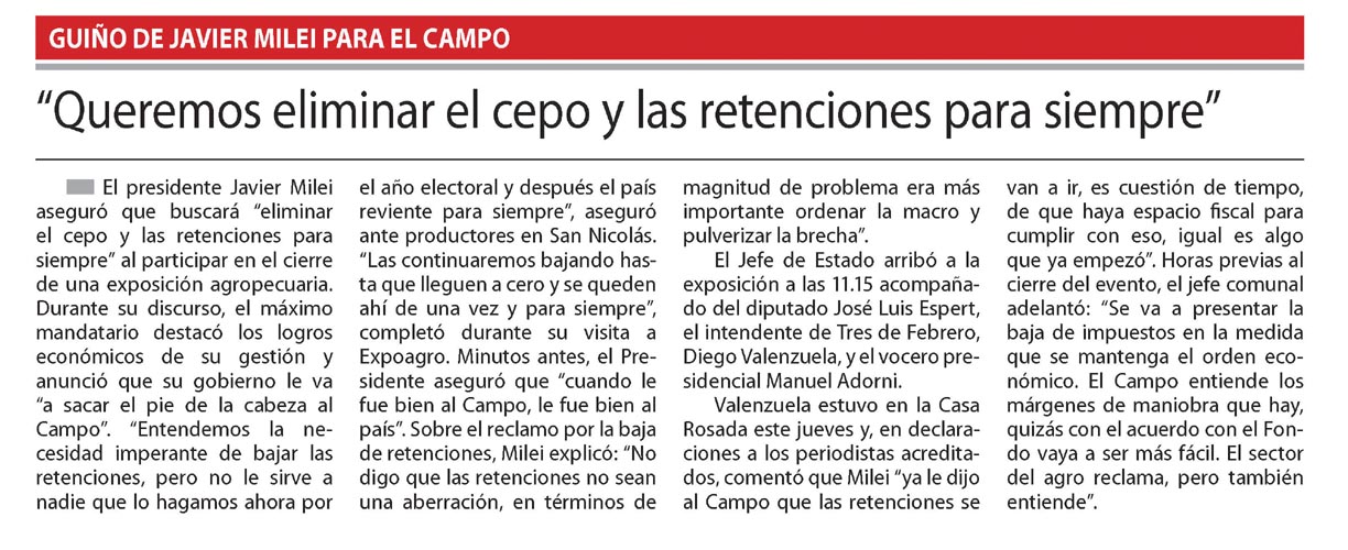 … productores en San Nicolás. “Las continuaremos bajando hasta que lleguen a cero y se queden ahí de una vez y para siempre», completó durante su visita a Expoagro. Minutos antes, el presidente afirmó que “cuando le fue bien al campo, le fue bien al país”. Sobre el reclamo por la baja de retenciones,…